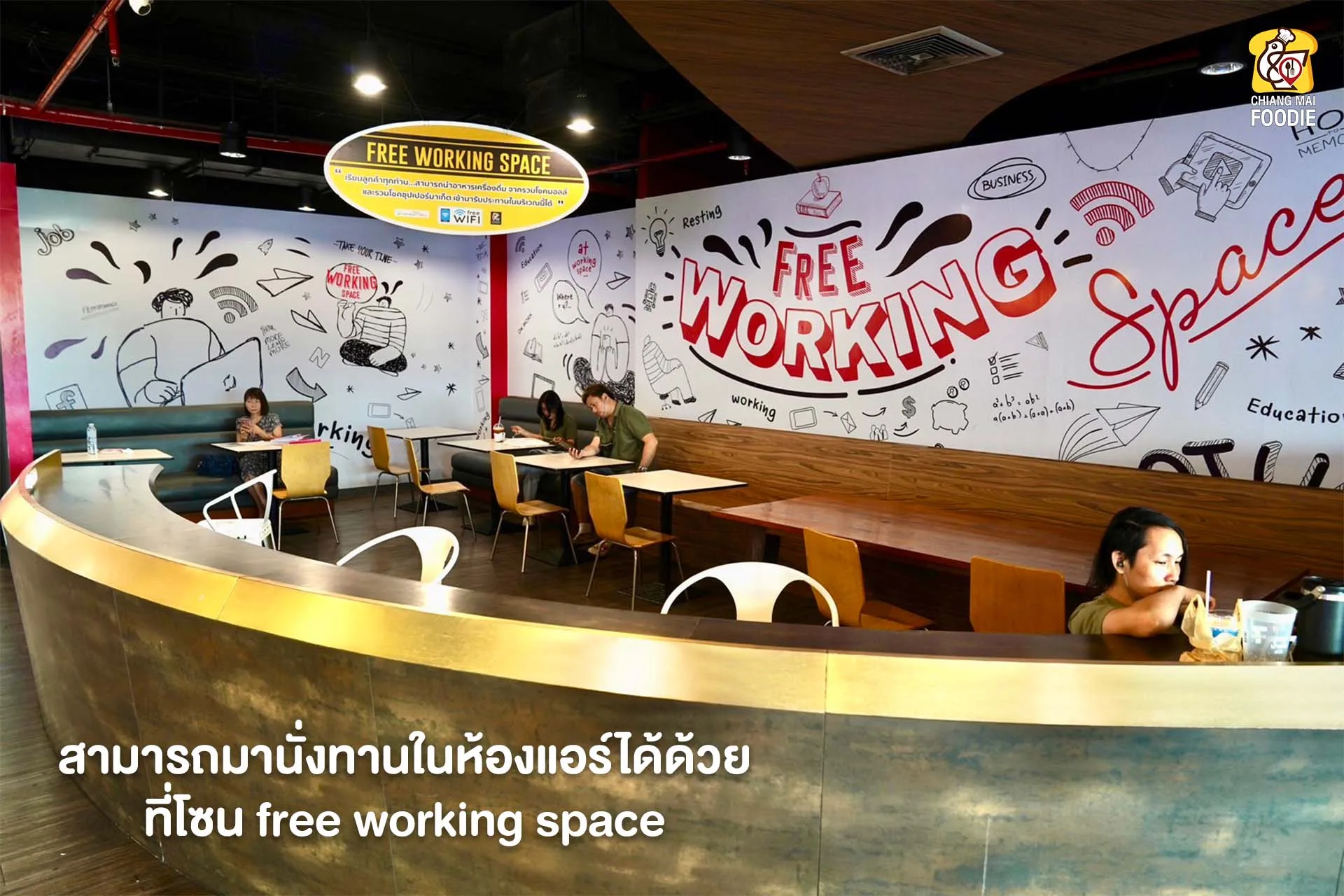 เวลาเสิร์ฟของสาขานี้จะเป็นจาน ถ้วยแบบ Take a way เจ่เจ้เปิงใจ๋จานข้าวหมูตุ๋นเนื้อตุ๋นเค้ามาก ถึงจะเป็นแบบกระดาษ แต่ลวดลายให้ฟิลถาดสมัยแม่อุ๊ย เลือกที่นั่งตรงโซนอาหารได้เลยนะ มีทั้งแบบโอเพ่นแอร์ แต่อยู่ในร่ม ฝนรินฝนตกไม่เปียกแน่นอน ส่วนใครต้องการกินแบบแอร์ฉ่ำ ก็เลือกเข้าไปนั่งได้ตรงโซน free working space ได้เลย