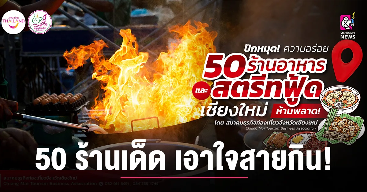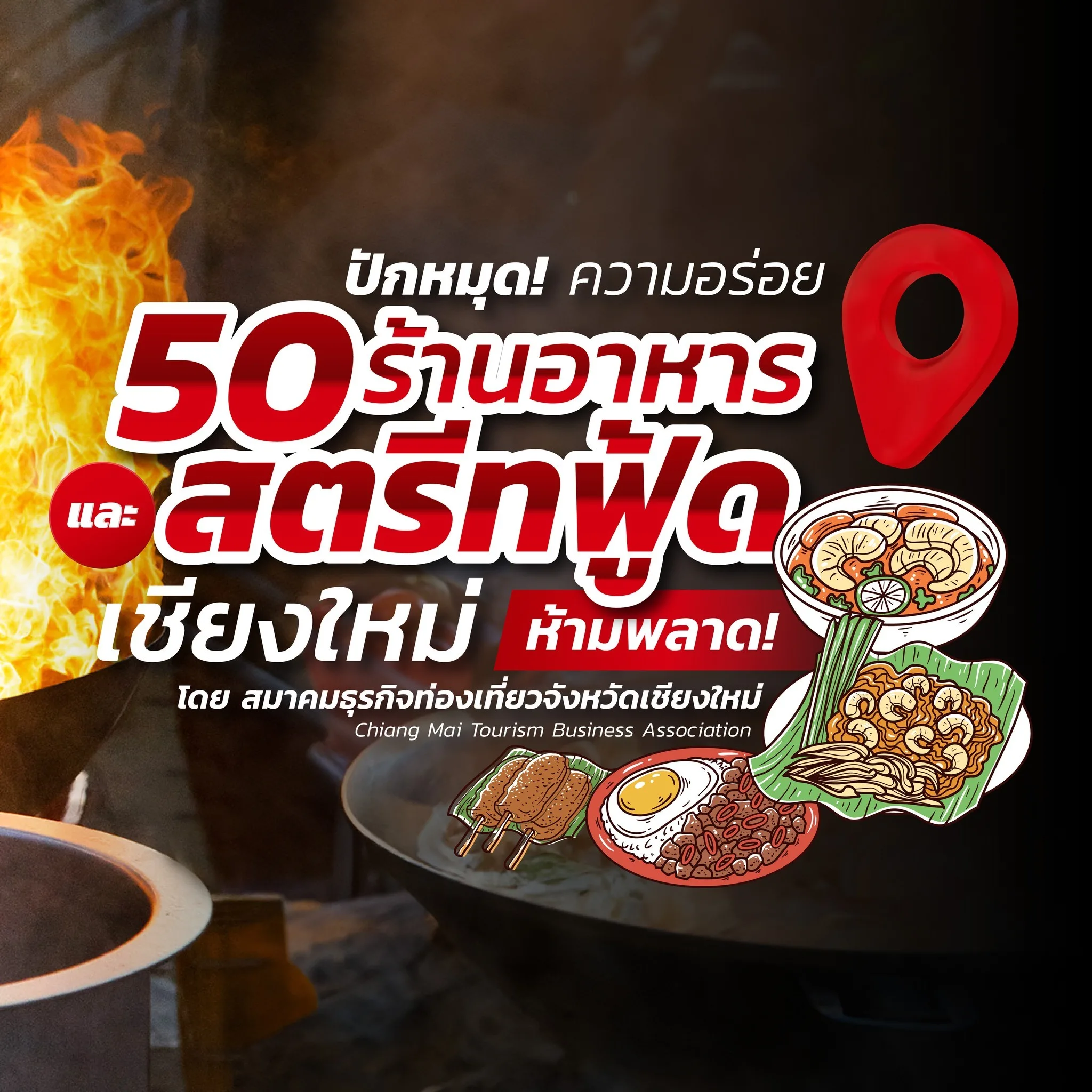 สมาคมธุรกิจท่องเที่ยวจังหวัดเชียงใหม่ ขอแนะนำ 50 ร้านอาหารและ Street Food สุดปังในเชียงใหม่! คัดสรรมาเพื่อเอาใจสายกินโดยเฉพาะ ทั้งของคาว ของหวาน ร้านอาหารบรรยากาศดี หรือ Street Food ชิคๆ ที่กำลังเป็นที่นิยมในโซเชียลมีเดีย