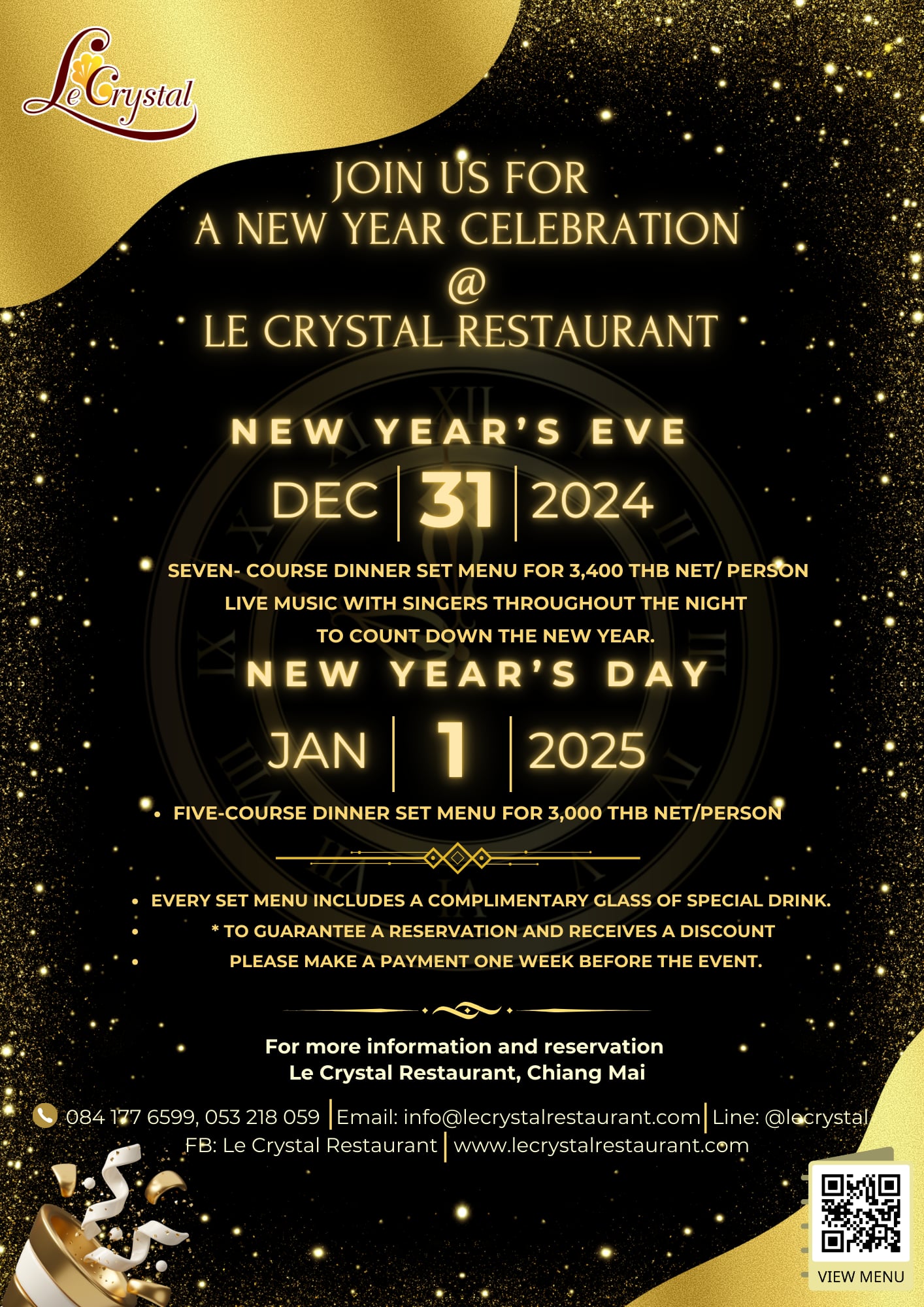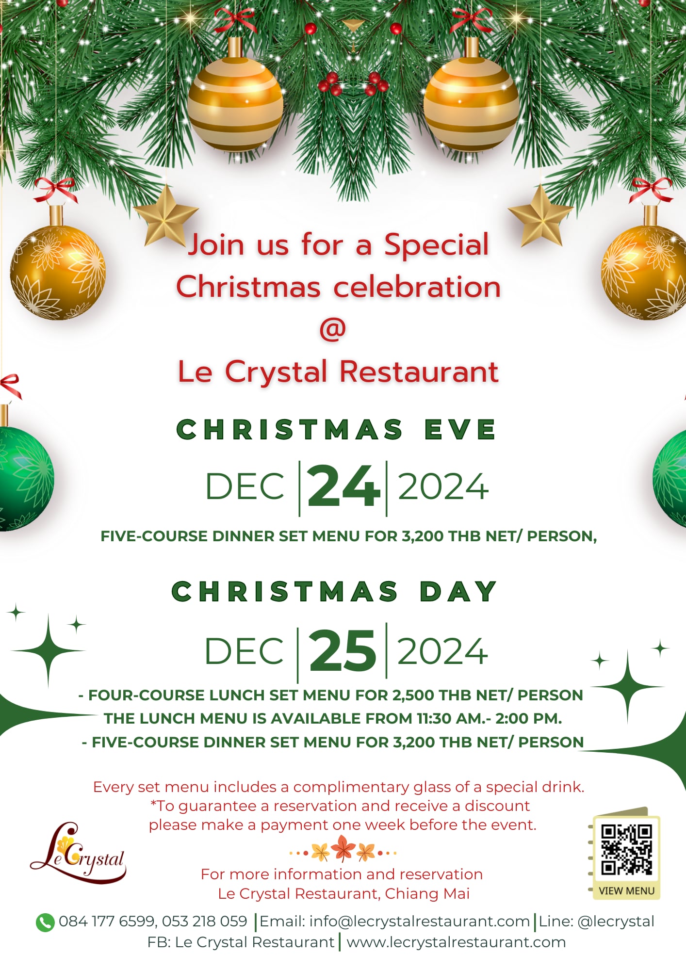 เทศกาลคริสต์มาสและส่งท้ายปีเก่าต้อนรับปีใหม่ นับเป็นช่วงเวลาสุดพิเศษที่ให้เราได้เติมเต็มความสุขด้วยการเฉลิมฉลองกันระหว่างครอบครัว กลุ่มเพื่อน หรือว่าคนรัก และอาหารมื้อพิเศษนับเป็นสิ่งที่ขาดไม่ได้สำหรับการเฉลิมฉลอง และหยิบยื่นช่วงเวลาดีๆ แต่งแต้มเทศกาลนี้ให้สนุกและมีสีสัน และใครกำลังมองหาร้านเพื่อเฉลิมฉลองคริสต์มาสและปีใหม่ที่ใกล้เข้ามา ร้านอาหารเลอ คริสตัลเห็นจะเป็นตัวเลือกที่ตอบโจทย์ เพราะที่นี่ได้จัดคอร์สพิเศษ กับเมนูจานพิเศษสำหรับช่วงเทศกาลนี้โดยเฉพาะ กับ 5 เซ็ตเมนูอาหาร ที่ตระเตรียมให้อร่อยกันในวันคริสต์มาสอีฟ วันคริสต์มาส และวันขึ้นปีใหม่ ท่ามกลางบรรยากาศแห่งลมหนาวริมฝั่งปิง รับรองว่าจะได้ฉลองกันอย่างเต็มอิ่มแบบที่ซานตาคลอสก็ให้ไม่ได้!