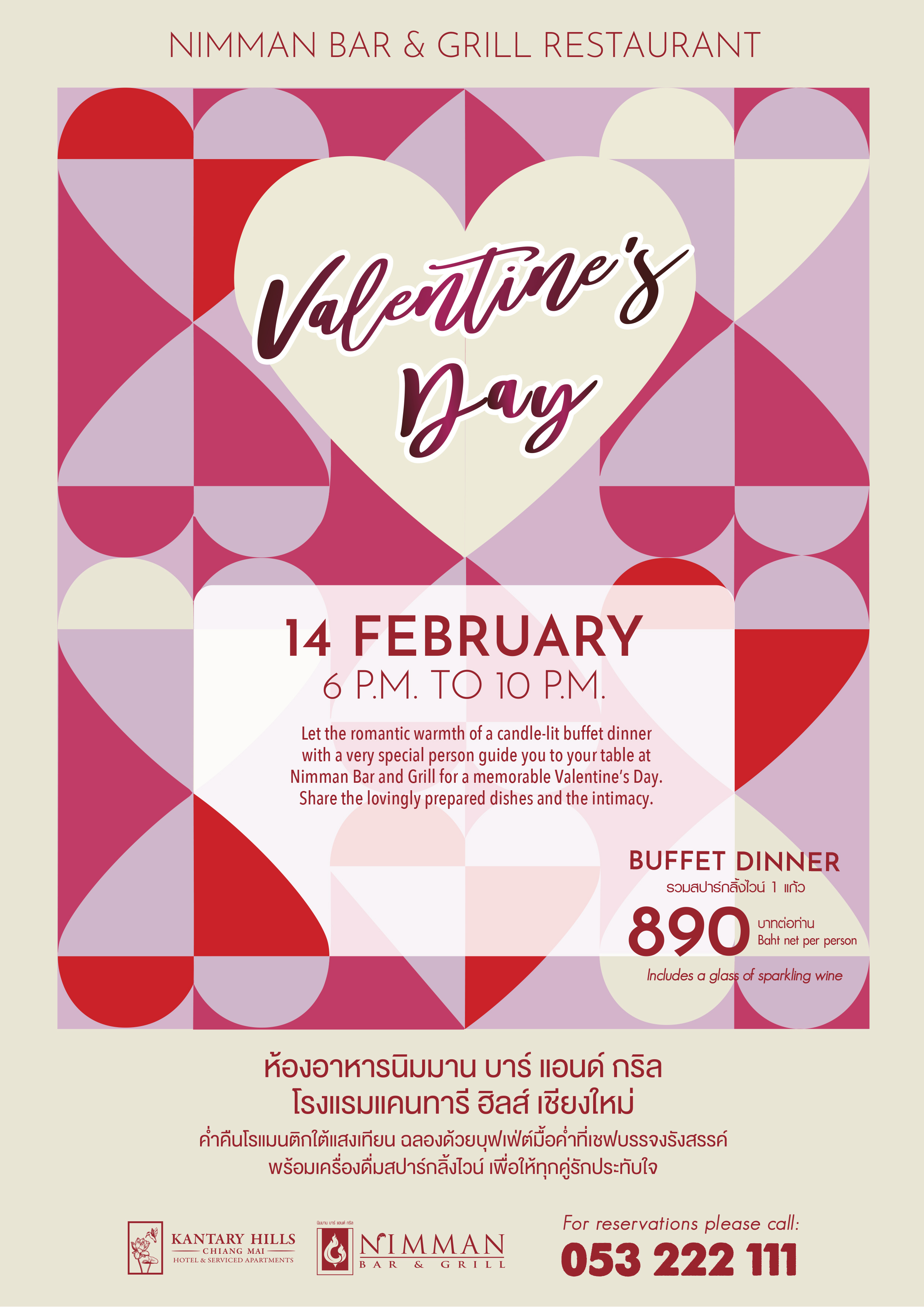 14 กุมภาพันธ์นี้ โรงแรมแคนทารีฮิลส์เชียงใหม่ เชิญมาเติมเต็มหัวใจให้ทุกคู่รัก ที่ห้องอาหารนิมมาน บาร์ แอนด์ กริล โรงแรมแคนทารี ฮิลส์ เชียงใหม่ (นิมมานฯ ซอย12)