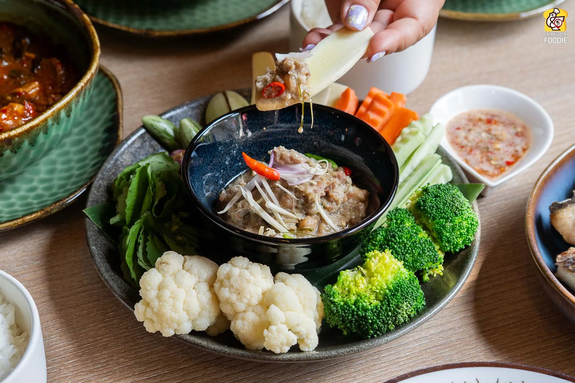 #ปลาพล่าน้ำจิ้มถั่วตัด ที่เป็นเอกลักษณ์ที่กรรมวิธีการทำแบบเฉพาะของทางร้าน ตอนทานก็ราดตัวปลาพล่าน้ำจิ้มถั่วตัดลงไปบนผักสดพร้อมกับคลุกเคล้ากัน รู้มาว่าหมัดเด็ดของน้ำจิ้มก็คือน้ำปลาท้องถิ่นของจันทบุรีอย่างน้ำปลาแท้สามกระต่าย ใครที่เคยทานจะรู้ว่าให้ความหอมกลมกล่อมไม่เหมือนใคร บอกเลยว่าเป็นการทานผักที่บันเทิงมาก อร่อยถูกปากเลยทีเดียวค่ะ