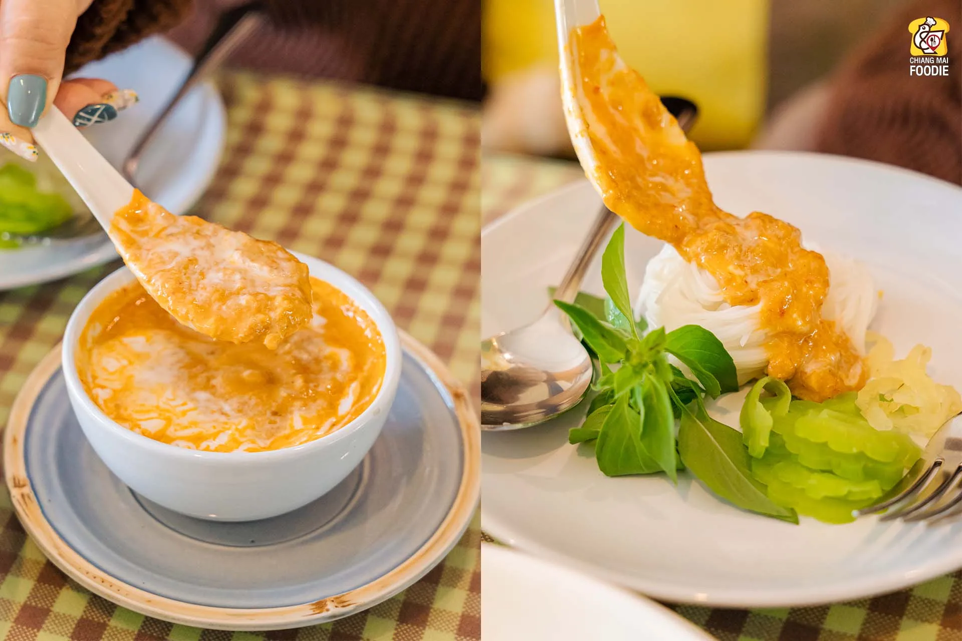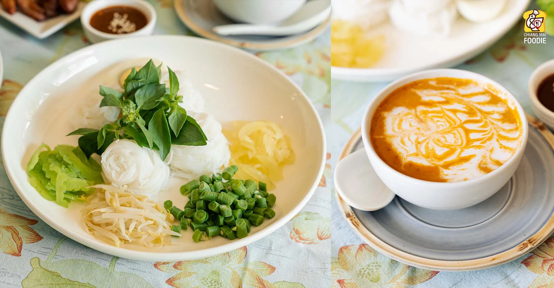 #ขนมจีนน้ำยาปลาเทร้าท์ เสิร์ฟมาพร้อมผักสดและผักลวก และตัวน้ำยาปลานี่เสิร์ฟมาแบบเก๋ๆ เป็นฟิลลาเต้อาร์ตกันเลยค่าา อร่อยเข้มข้นมาก