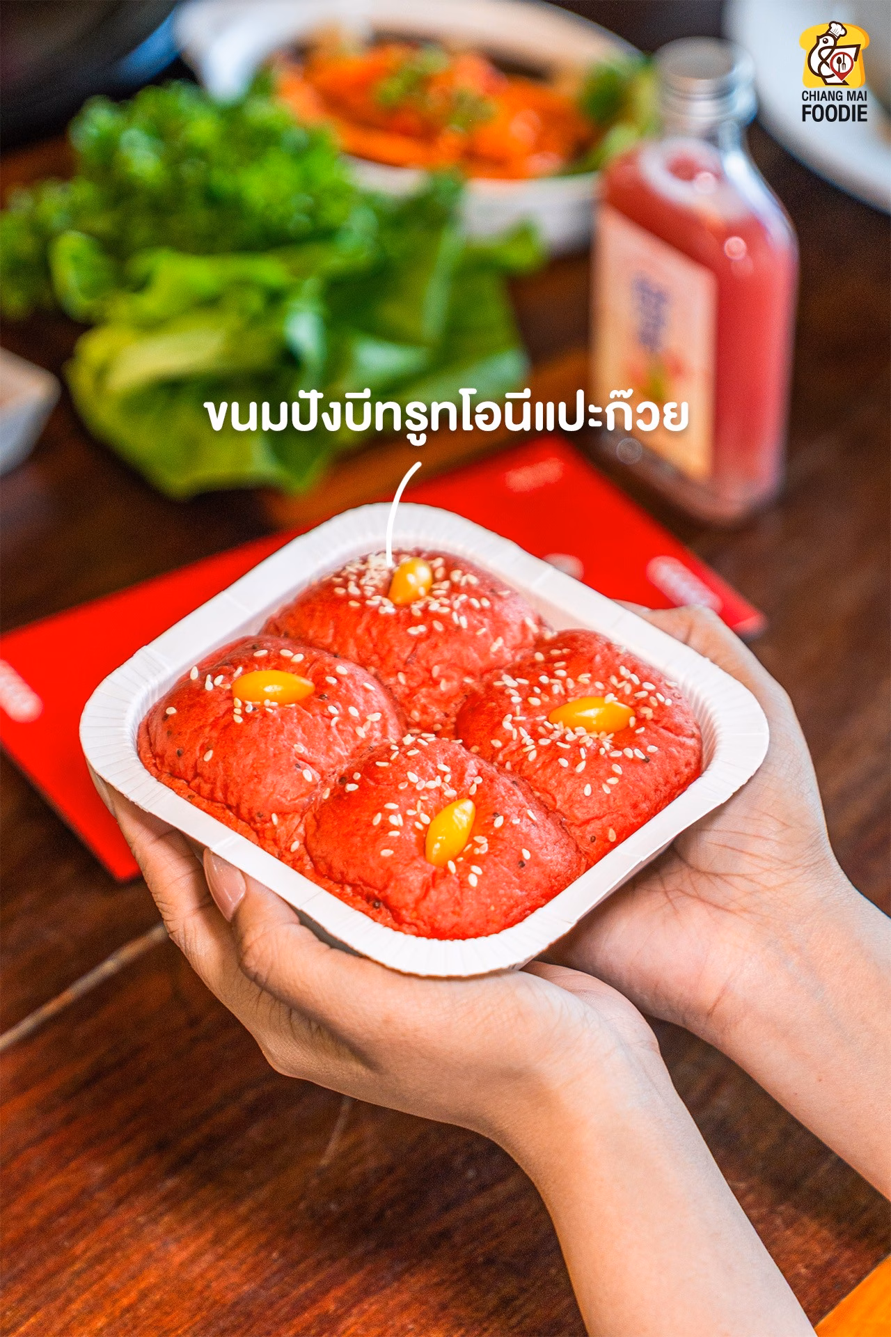 🔺ขนมปังบีทรูทโอนีแปะก๊วย — ตัวแป้งนุ่มมาก โปะข้างบนด้วยแปะก๊วย ข้างในมีไส้ยืด ๆ นุ่ม ๆ เหมาะสำหรับ เป็นมื้อทานเล่น