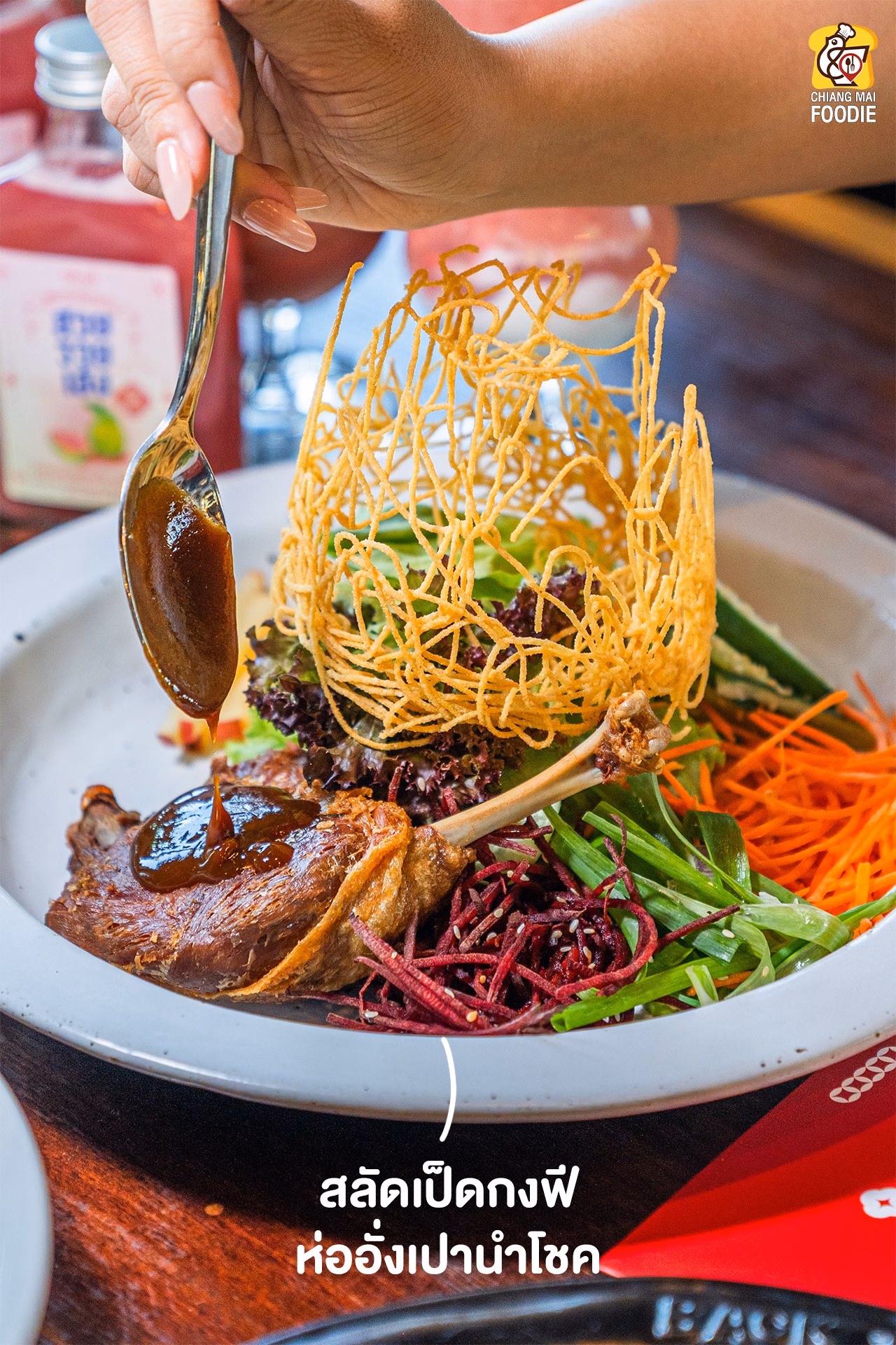 🔺สลัดเป็ดกงฟีห่ออั่งเปานำโชค — สารพัดเมนูผัก สด สะอาด จานนี้คุณประโยชน์เต็มเปี่ยม เนื้อเป็ดนุ่ม ทานคู่กับน้ำซอส ยิ่งเพิ่มความกลมกล่อม