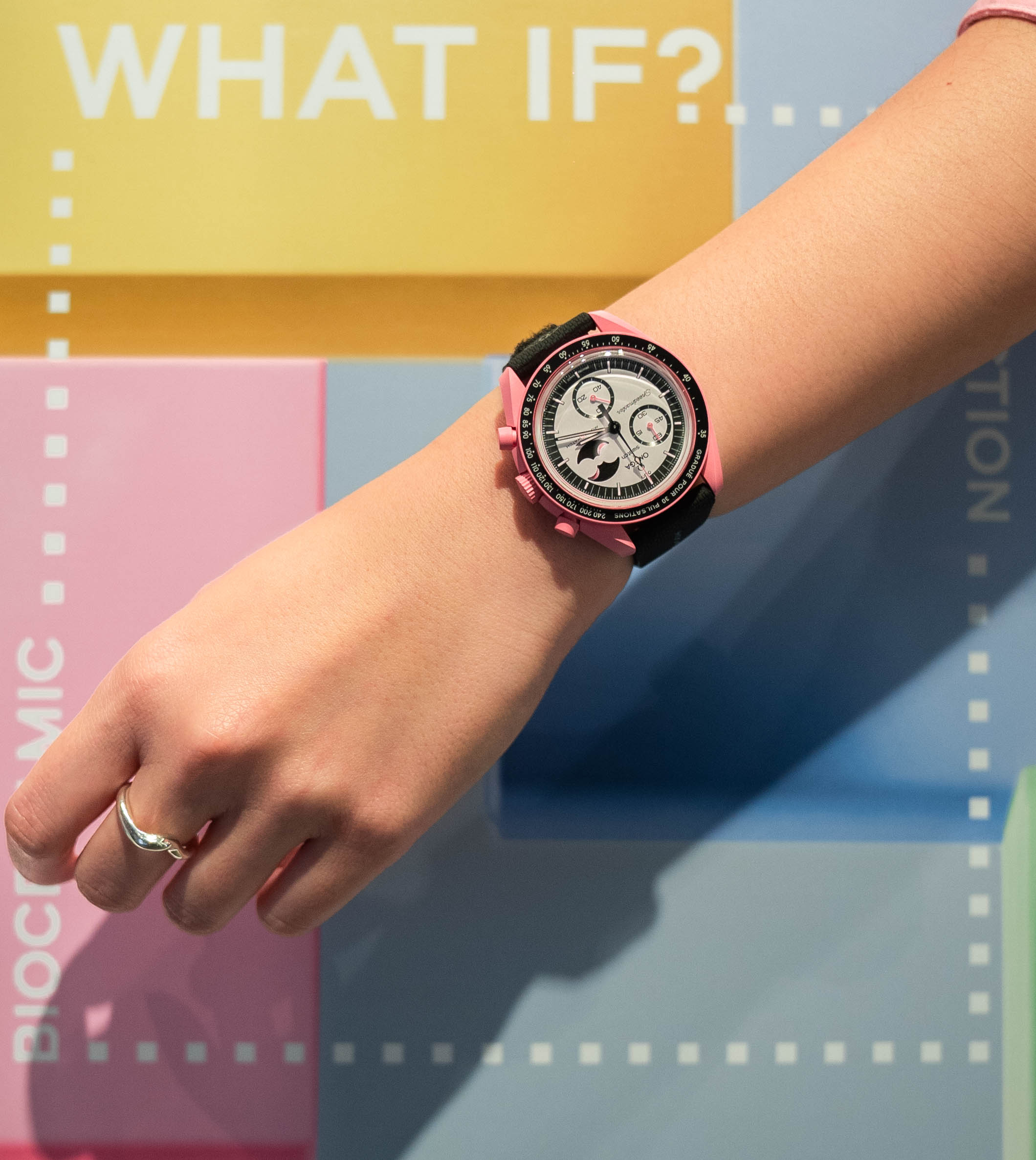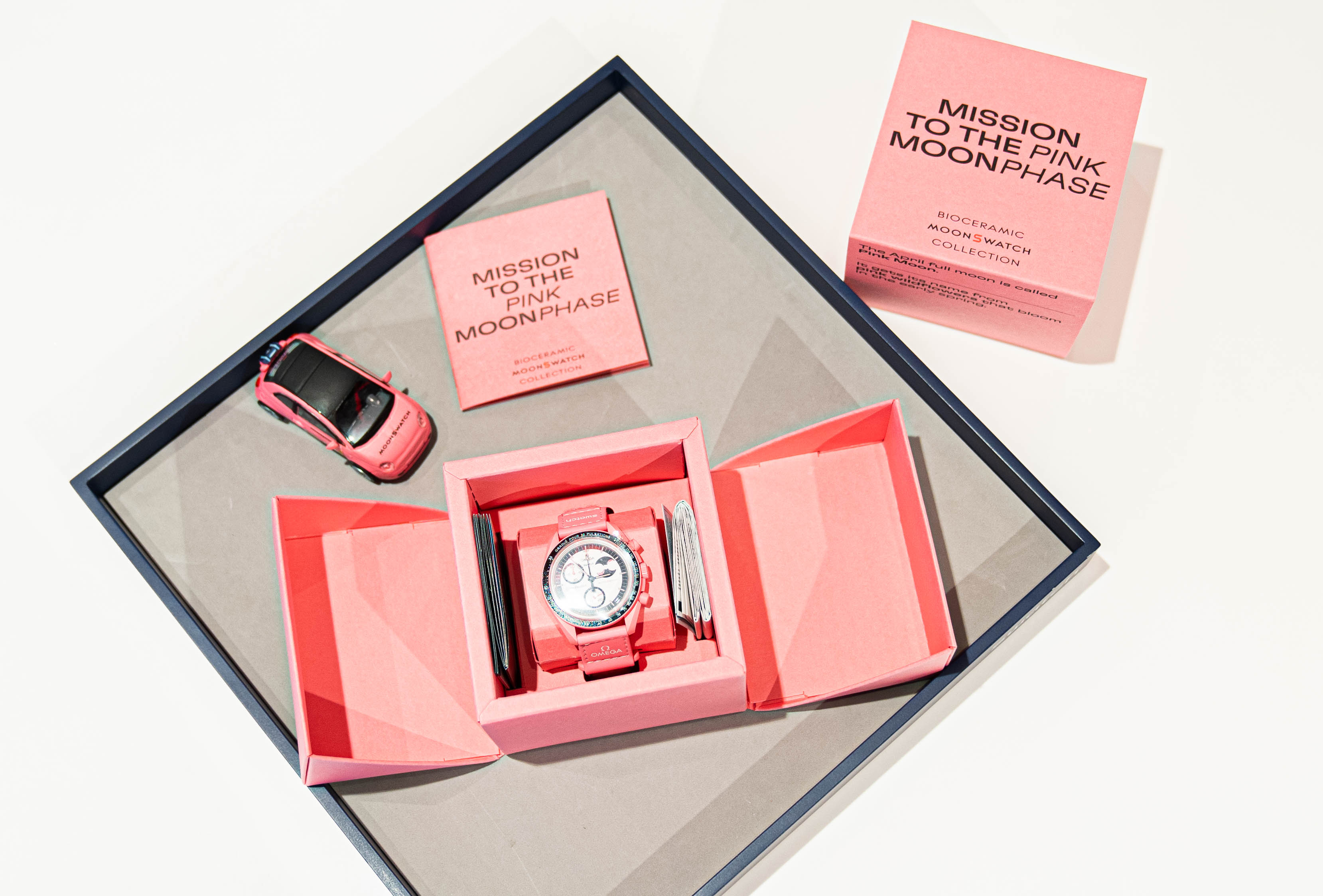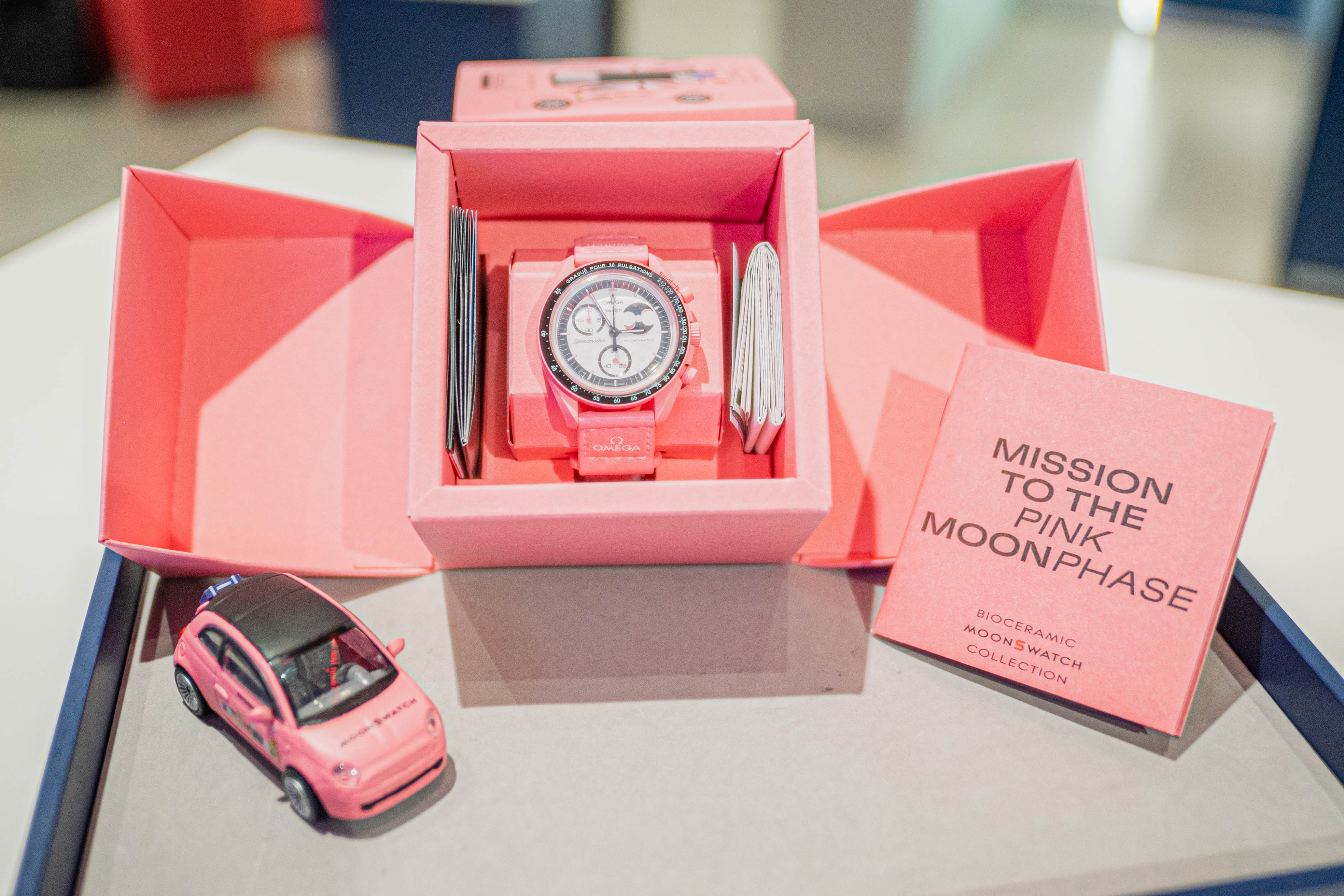 นาฬิกา MISSION TO THE PINK MOONPHASE สีชมพู ที่เป็นการฉลองปรากฏการณ์ไมโครมูนในเดือนเมษายน จะสะกดสายตาด้วยความเจิดจรัสดุจดวงจันทร์ มาพร้อมหน้าปัดสีดำและโอปอลีนสีเงิน-ชมพู ที่มีหลักชั่วโมงและเข็มนาฬิกาสีดำเคลือบสารเรืองแสง Super-LumiNova® เกรด A ซึ่งจะเรืองแสงสีชมพูสดใสในที่มืด และทำให้อ่านง่ายในทุกสภาพแสง ส่วนขอบหน้าปัด Bioceramic สีดำก็มีมาตรวัดชีพจร ที่ทำให้ผู้สวมใส่วัดอัตราการเต้นของหัวใจได้อย่างสะดวก วางจำหน่ายตั้งแต่วันที่ 1 เมษายนเป็นต้นไป ในระยะเวลาจำกัดเท่านั้น ติดตามดูรถ Rolling Planet สีชมพูทางโซเชียลมีเดียของ Swatch เพื่อดูว่าจะหาซื้อรุ่นนี้ได้ที่ไหนบ้าง