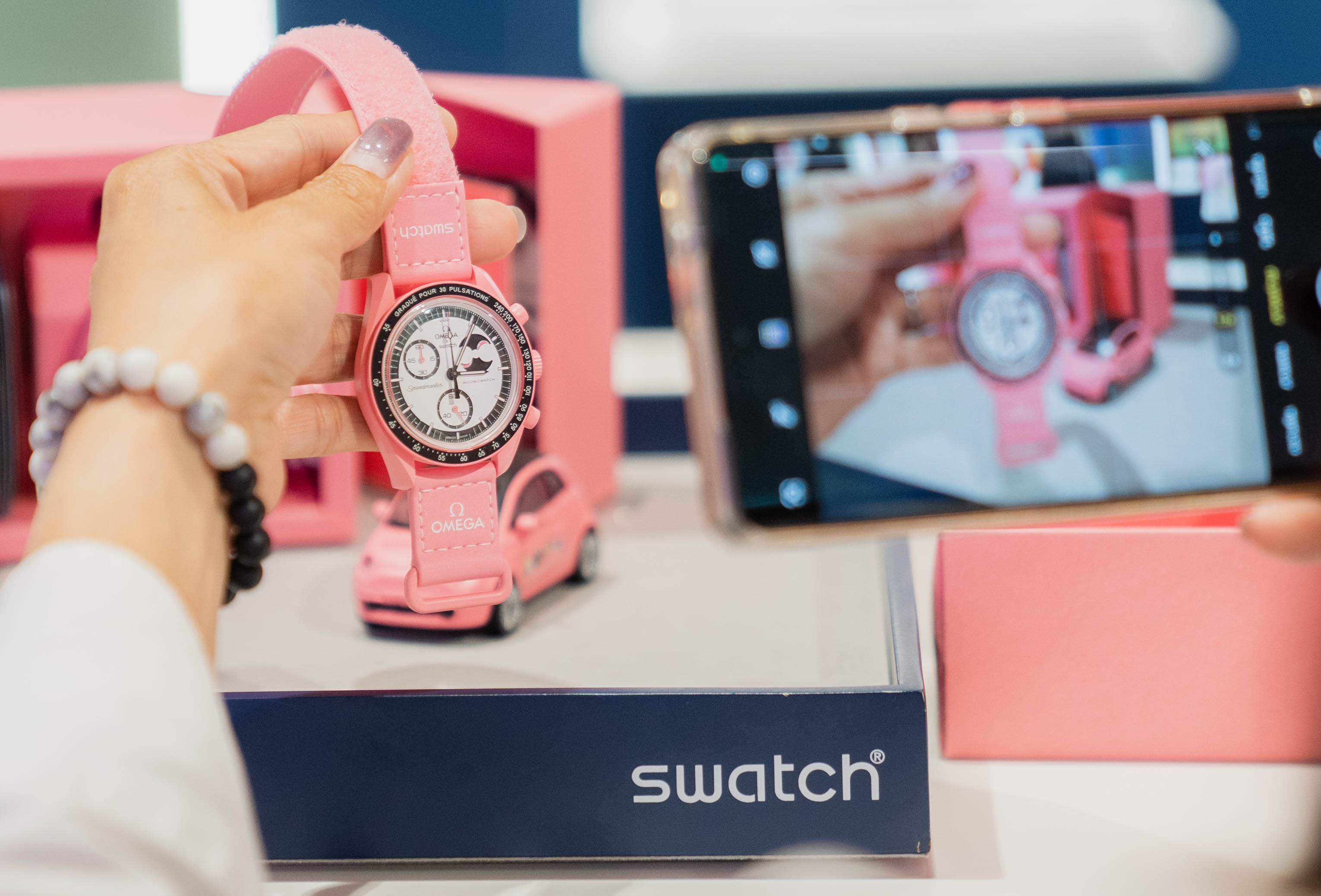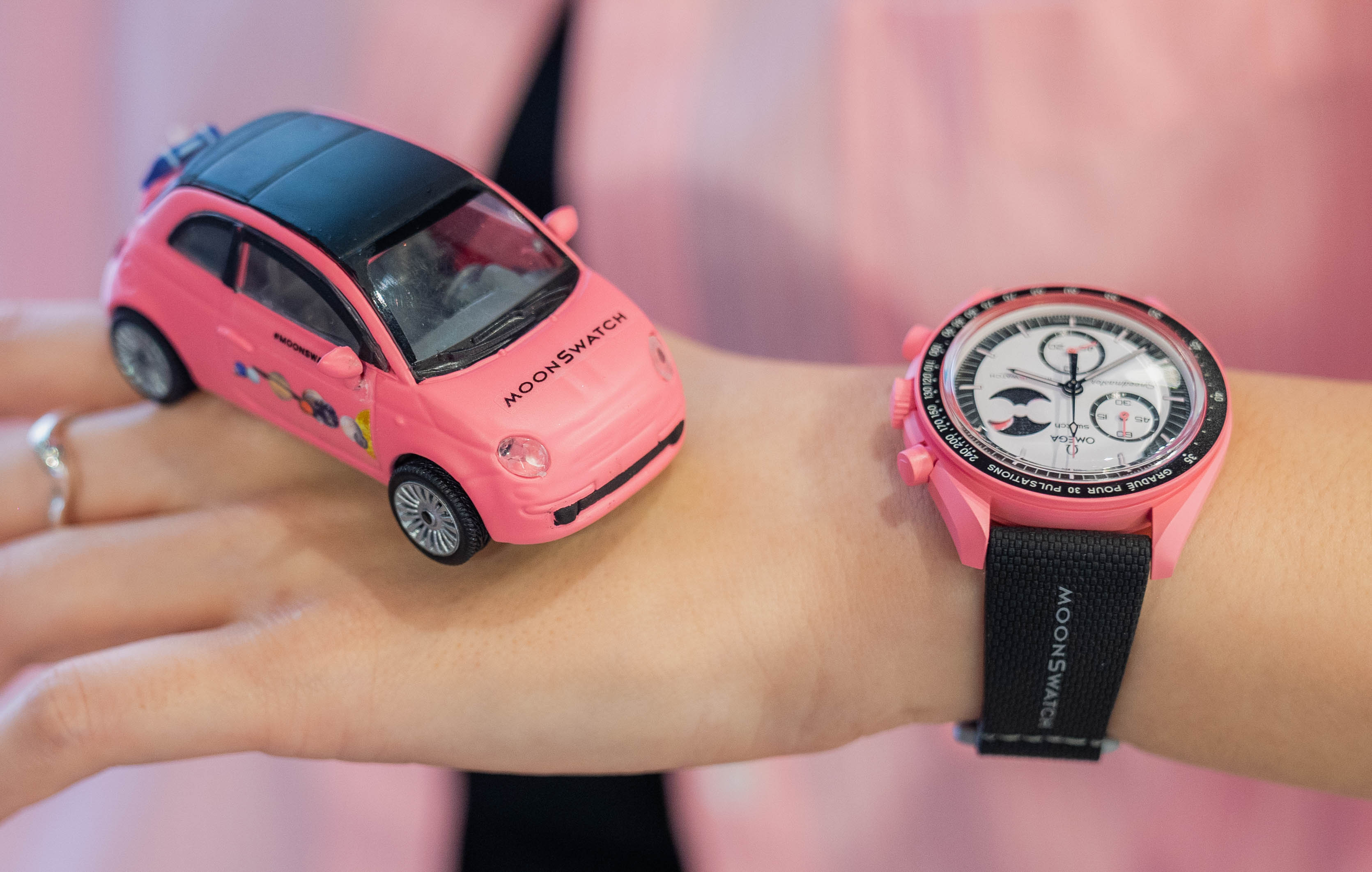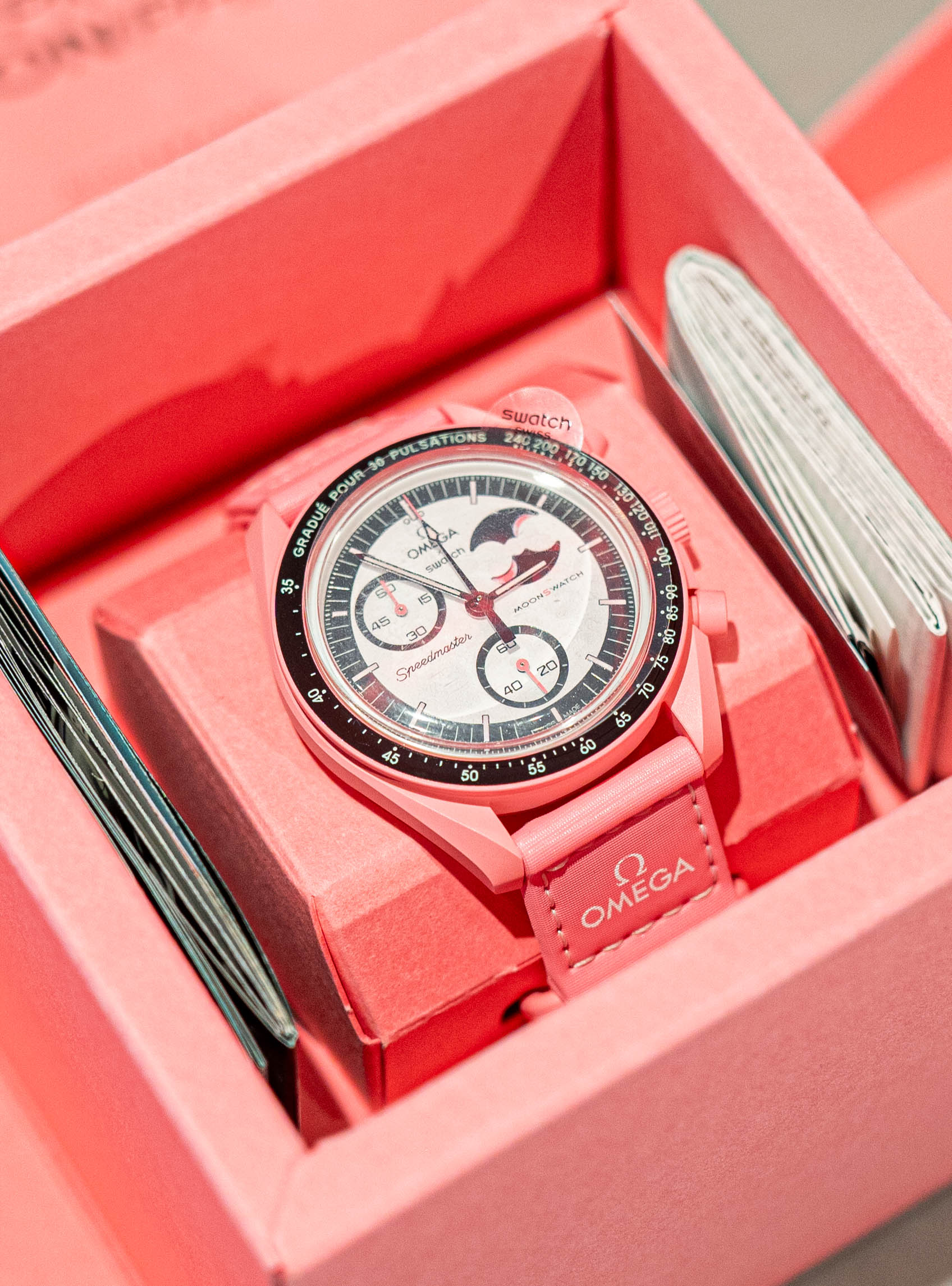 นาฬิกา MISSION TO THE PINK MOONPHASE สีชมพู ที่เป็นการฉลองปรากฏการณ์ไมโครมูนในเดือนเมษายน จะสะกดสายตาด้วยความเจิดจรัสดุจดวงจันทร์ มาพร้อมหน้าปัดสีดำและโอปอลีนสีเงิน-ชมพู ที่มีหลักชั่วโมงและเข็มนาฬิกาสีดำเคลือบสารเรืองแสง Super-LumiNova® เกรด A ซึ่งจะเรืองแสงสีชมพูสดใสในที่มืด และทำให้อ่านง่ายในทุกสภาพแสง ส่วนขอบหน้าปัด Bioceramic สีดำก็มีมาตรวัดชีพจร ที่ทำให้ผู้สวมใส่วัดอัตราการเต้นของหัวใจได้อย่างสะดวก วางจำหน่ายตั้งแต่วันที่ 1 เมษายนเป็นต้นไป ในระยะเวลาจำกัดเท่านั้น ติดตามดูรถ Rolling Planet สีชมพูทางโซเชียลมีเดียของ Swatch เพื่อดูว่าจะหาซื้อรุ่นนี้ได้ที่ไหนบ้าง