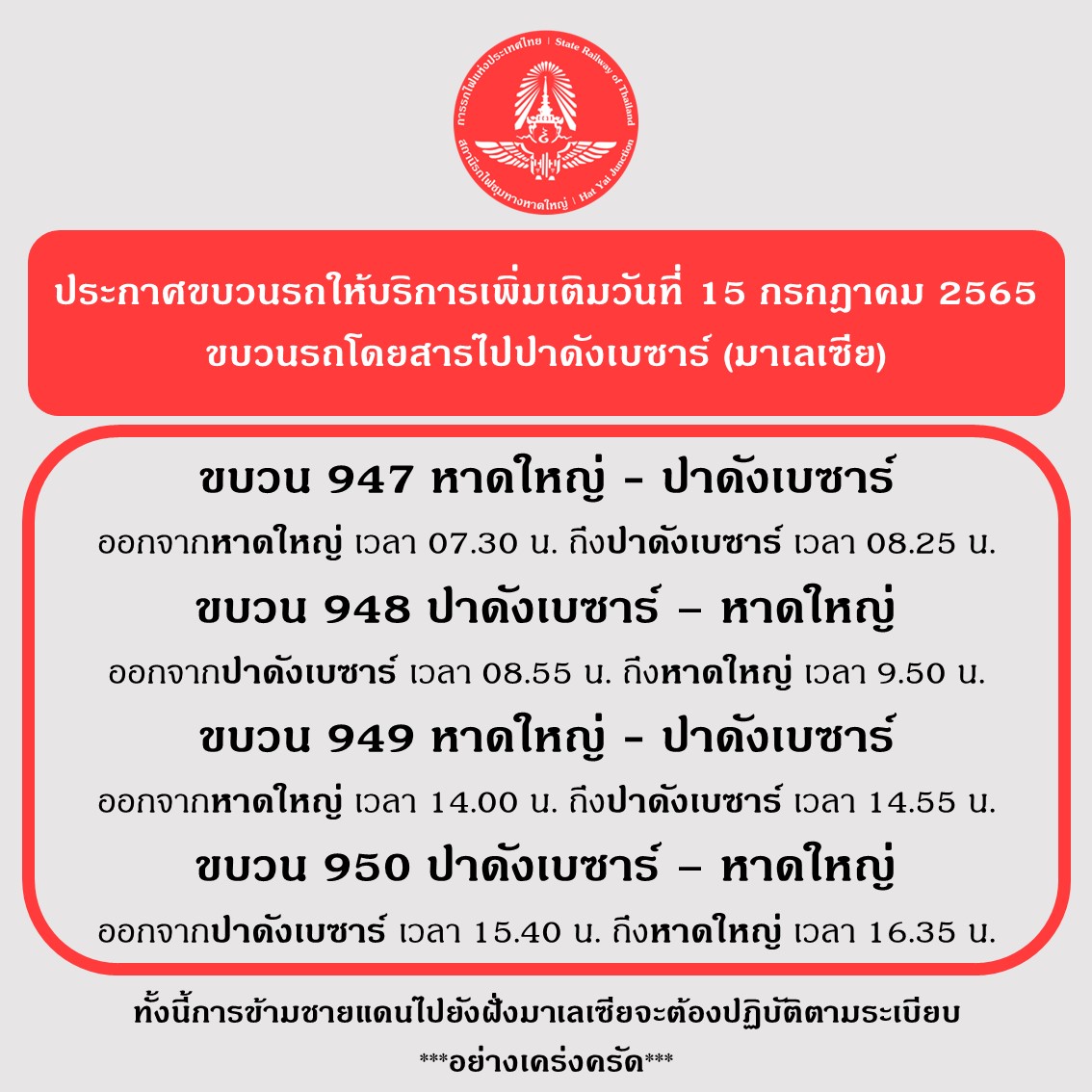 ขบวน 947 หาดใหญ่ – ปาดังเบซาร์ ออกจากหาดใหญ่เวลา 07.30 น.