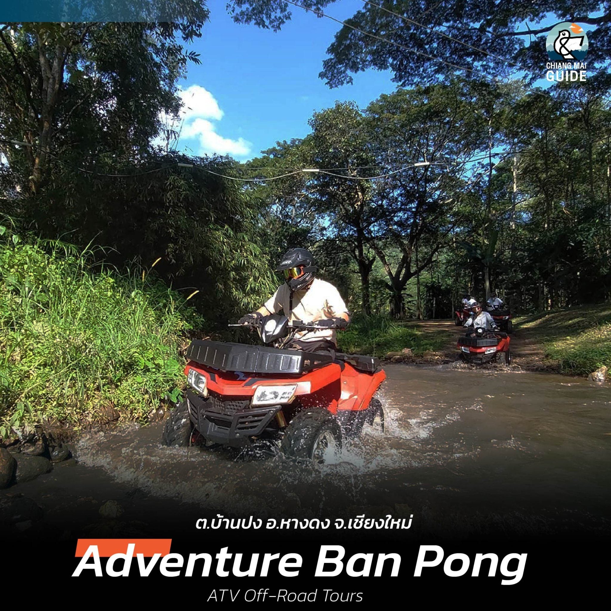 เพิ่มความเร้าใจกับการขับเอทีวี ซิ่งบนเส้นทางออฟโร้ด ฝ่าดงป่าไม้ในเขตหมู่บ้านบ้านปง ซึ่งเต็มไปด้วยความอุดมสมบูรณ์ทางธรรมชาติของระบบนิเวศน์ รับอากาศบริสุทธิ์ ต้องจองวันและเวลาล่วงหน้า