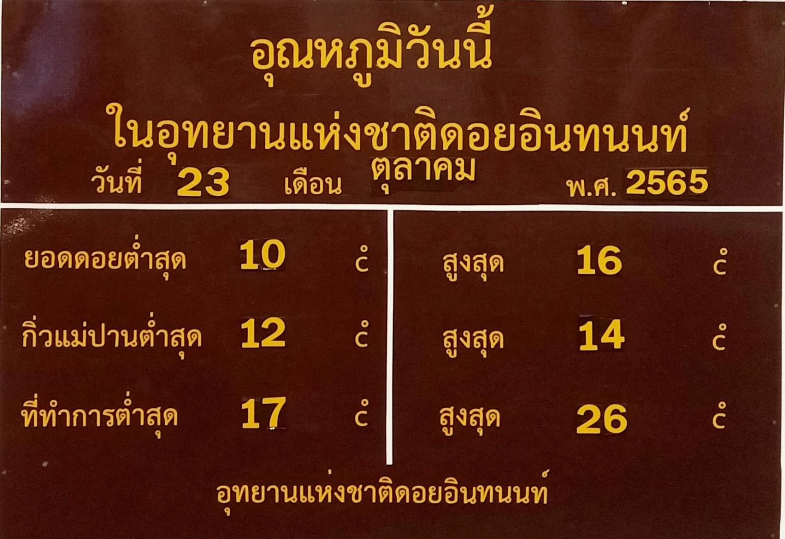 ส่วนบรรยากาศบนดอยอินทนนท์ เช้านี้ นายเกรียงไกร ไชยพิเศษ หัวหน้าอุทยานแห่งชาติดอยอินทนนท์ รายงานว่า เช้านี้มีฝนตกสลับกับหมอกลงหนาแน่น แต่นักท่องเที่ยวก็ไม่ย่อท้อช่วงวันหยุดยาวแบบนี้ บางคนก็ขึ้นมาตอนเช้าวันนี้เพื่อจะไปสัมผัสอากาศหนาวที่ยอดดอย กิ่วแม่ปาน ซึ่งเป็นวันที่ 3 แล้วอากาศปิด ไม่สามารถมองเห็นทะเลหมอกหรือพระอาทิตย์ขึ้นยามเช้าได้ อุณหภูมิเช้านี้วัดได้ต่ำสุด ที่ยอดดอย 10 องศาฯ กิ่วแม่ปาน 12 องศาฯ และที่ทำการอุทยาน 17 องศาฯ