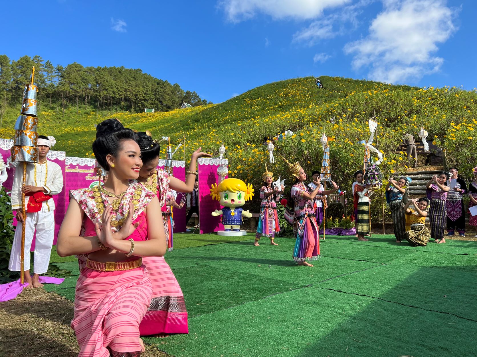 เมื่อวันที่ 9 พฤศจิกายน 2565 ที่ผ่านมา นายประเสริฐ์ จิตต์พลีชีพ รองผู้ว่าราชการ จ.แม่ฮ่องสอน เป็นประธาน ฯ โดยมี นายณรงค์พัชญ์ นาคทรัพย์ นาย อ.ขุนยวม นายจำลอง จิโนเป็ง นายก ทต.ขุนยวม นายธารา ชมสมองเลิศ นายก อบต.แม่อูคอ ว่าที่ ร.ต. ภาณุวัฒน์ ขัดนาค ผู้อำนวยกา รสำนักงานการท่องเที่ยวแห่งประเทศไทย (ททท.) แม่ฮ่องสอน การท่องเที่ยวและกีฬาจังหวัด วนอุทยานทุ่งดอกบัวตอง หน่วยงานภาครัฐ เอกชน และประชาชนในพื้นที่ ต.แม่อูคอ ร่วมเปิดเทศกาลดอกบัวตองบานบนดอยแม่อูคอ อย่างเป็นทางการ โดยมีพิธีสู่ขวัญดอกบัวตอง การแสดงศิลปวัฒนธรรมชาติพันธุ์ พร้อมต้อนรับนักท่องเที่ยว ที่เดินทางสู่ทุ่งดอกบัวตองบานบนดอยแม่อูคอ บนพื้นที่กว่า 500 ไร่ ที่มีความสูงจากระดับน้ำทะเลกว่า 1,600 เมตร ล้อมรอบไปด้วยป่าไม้และหุบเขาสลับซับซ้อน กลางคืนอากาศจะหนาวเย็น อุณหภูมิจะอยู่ที่ 4-6 องศา บางวันเหลือ 1 องศา อากาศบนทุ่งบัวตองจะหนาวมาก ดอกบัวตองจะบานสะพรั่งบนยอดดอยในช่วงเดือนพฤศจิกายน จนถึงต้นเดือนธันวาคมของทุกปี