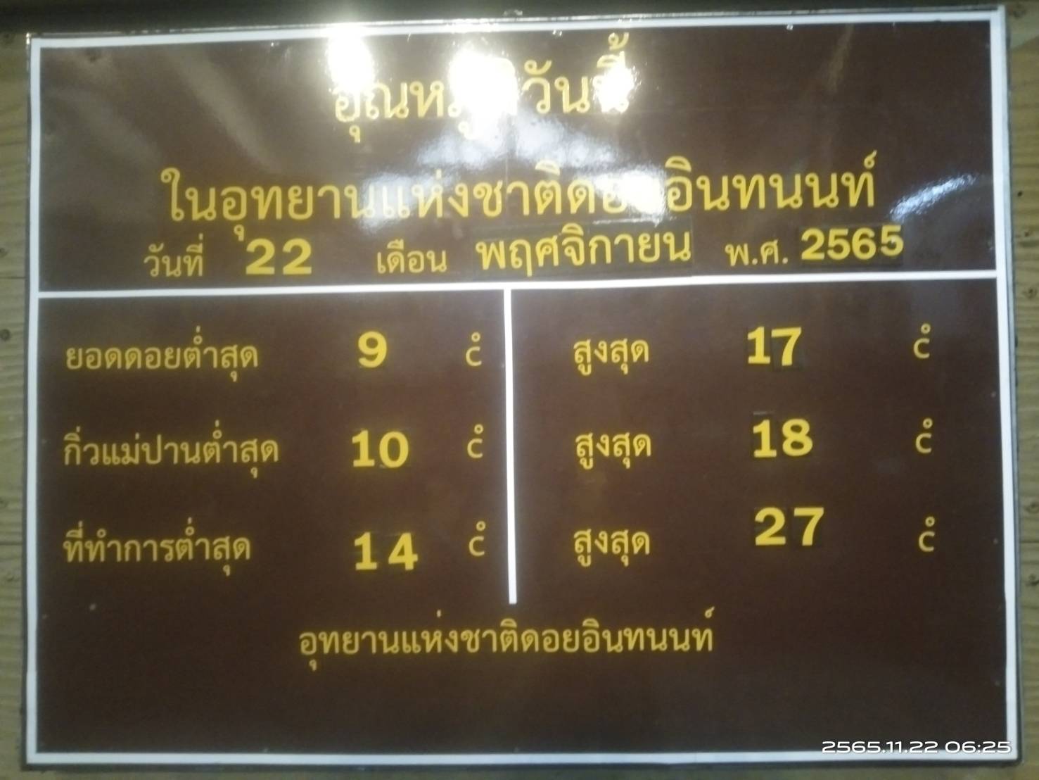 เมื่อเวลา 07.00 น. วันที่ 22 พ.ย. 65 นายเกรียงไกร ไชยพิเศษ หัวหน้าอุทยานแห่งชาติดอยอินทนนท์ อ.จอมทอง จ.เชียงใหม่ แจ้งว่า เช้าวันนี้สภาพอากาศบนดอยอินทนนท์ อากาศเปิดโล่งสบาย สามารถที่จะมองเห็นพระอาทิตย์ขึ้นแสงแรกของวันได้งดงามมาก ท่ามกลางบรรยากาศที่หนาวเย็น โดยอุณหภูมิเฉลี่ยเช้านี้ วัดได้ต่ำสุด องศาฯ ที่ยอดดอย ขณะที่กิ่วแม่ปาน 10 องศาฯ และที่ทำการอุทยานฯ 14 องศาฯ นับว่ายังอยู่ในโหมดของความหนาวเย็น