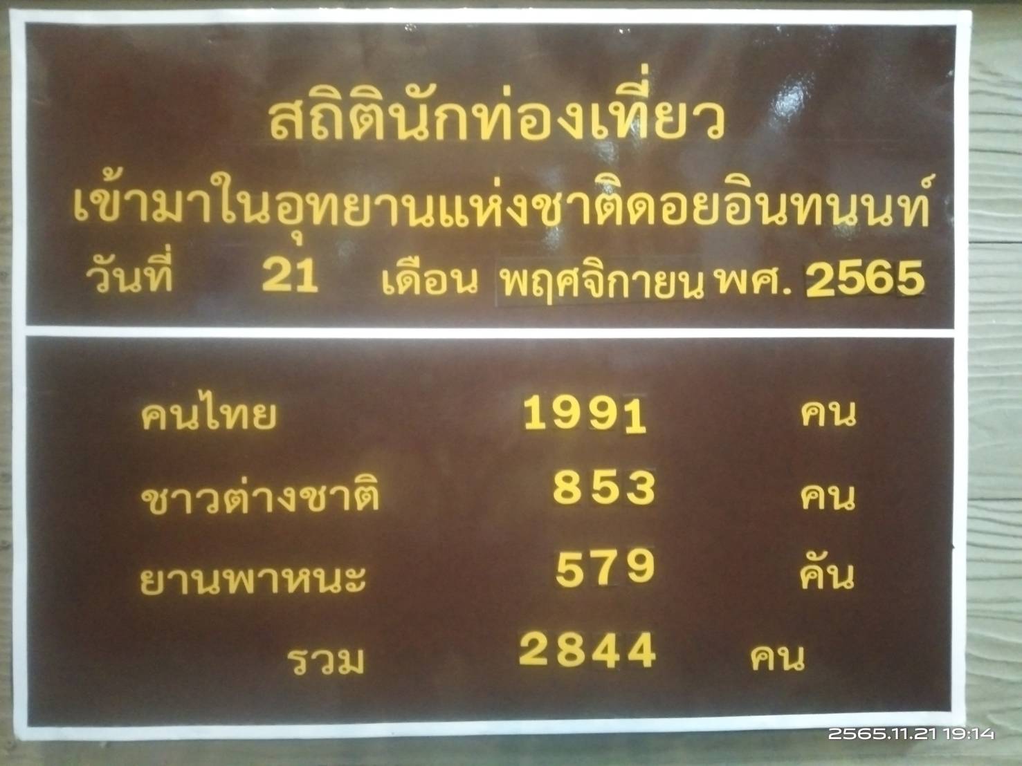 สำหรับนักท่องเที่ยวที่ขึ้นมาเที่ยวเมื่อวันที่ 21 พ.ย. 2565 รวมนักท่องเที่ยวทั้งหมด 2,844 คน และนักท่องเที่ยวจะหนาแน่นในช่วงวันหยุดสุดสัปดาห์ และวันหยุดยาว ส่วนที่พักที่เป็นบ้านพักตอนนี้ถูกจองยาวไปถึงต้นปีหน้าแล้ว ส่วนนักท่องเที่ยวที่ต้องการจะพักที่ดอยอินทนนท์ ในช่วงเทศกาลส่งท้ายปีเก่า-ต้อนรับปีใหม่ก็สามารถที่จะนอนกางเต็นท์ได้ ปีนี้จะเปิดให้บริการบริเวณที่ทำการอุทยานฯ ได้