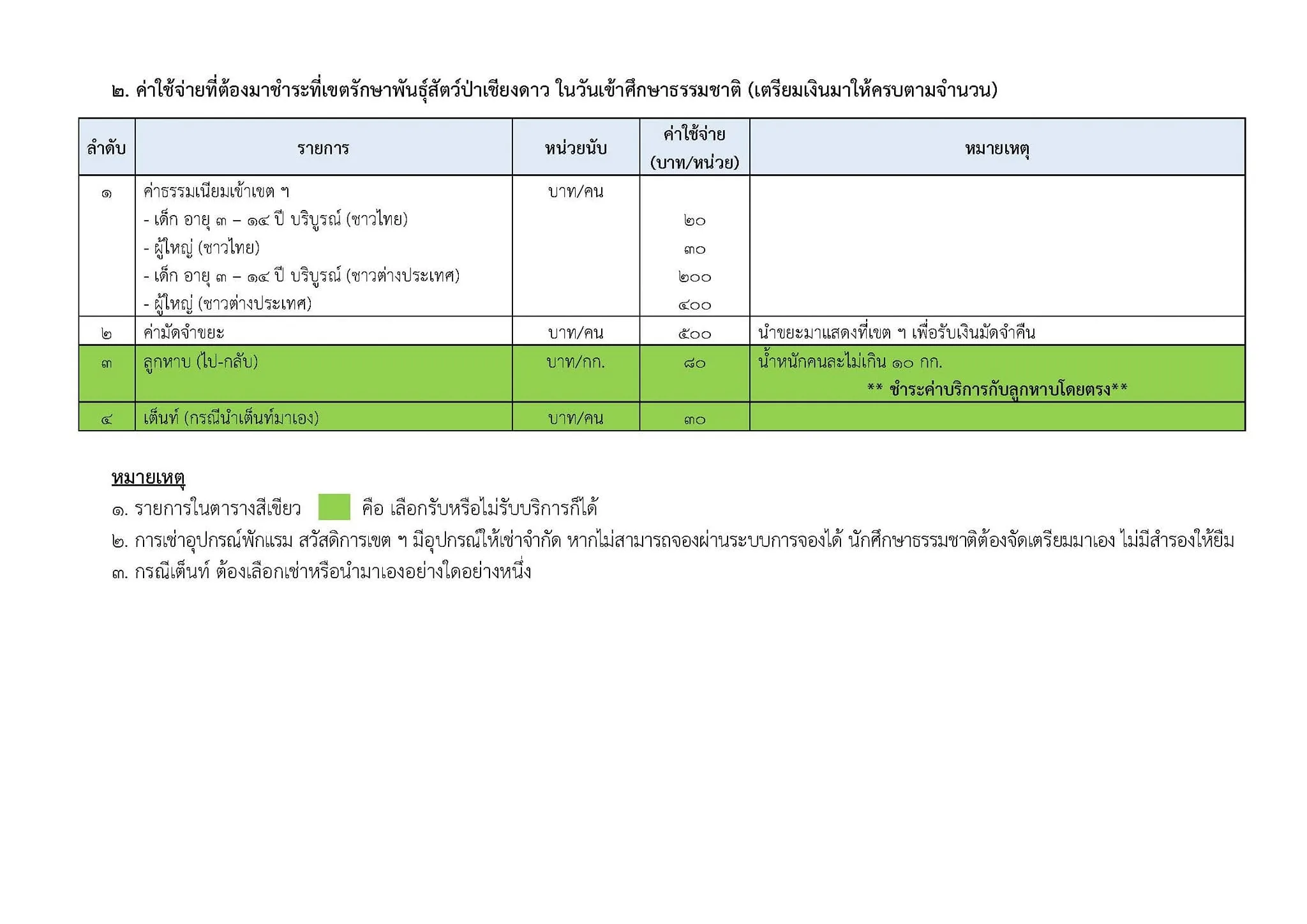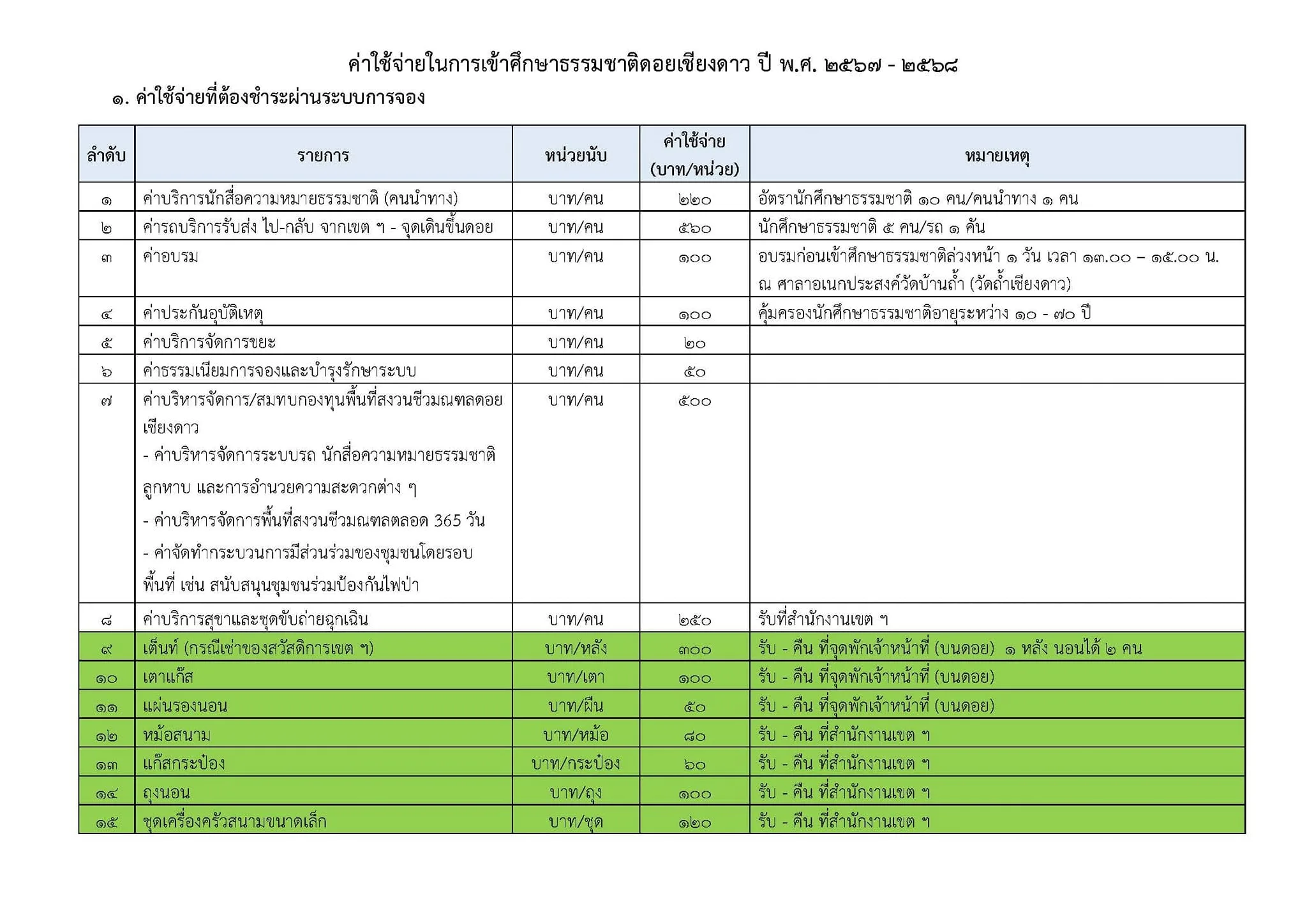 ค่าใช้จ่ายในการศึกษาธรรมชาติ เส้นทางศึกษาธรรมชาติดอยหลวงเชียงดาว ปี พ.ศ. 2567-2568