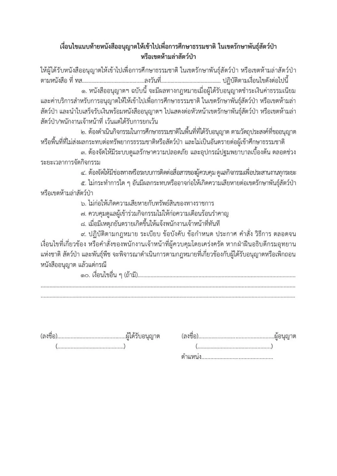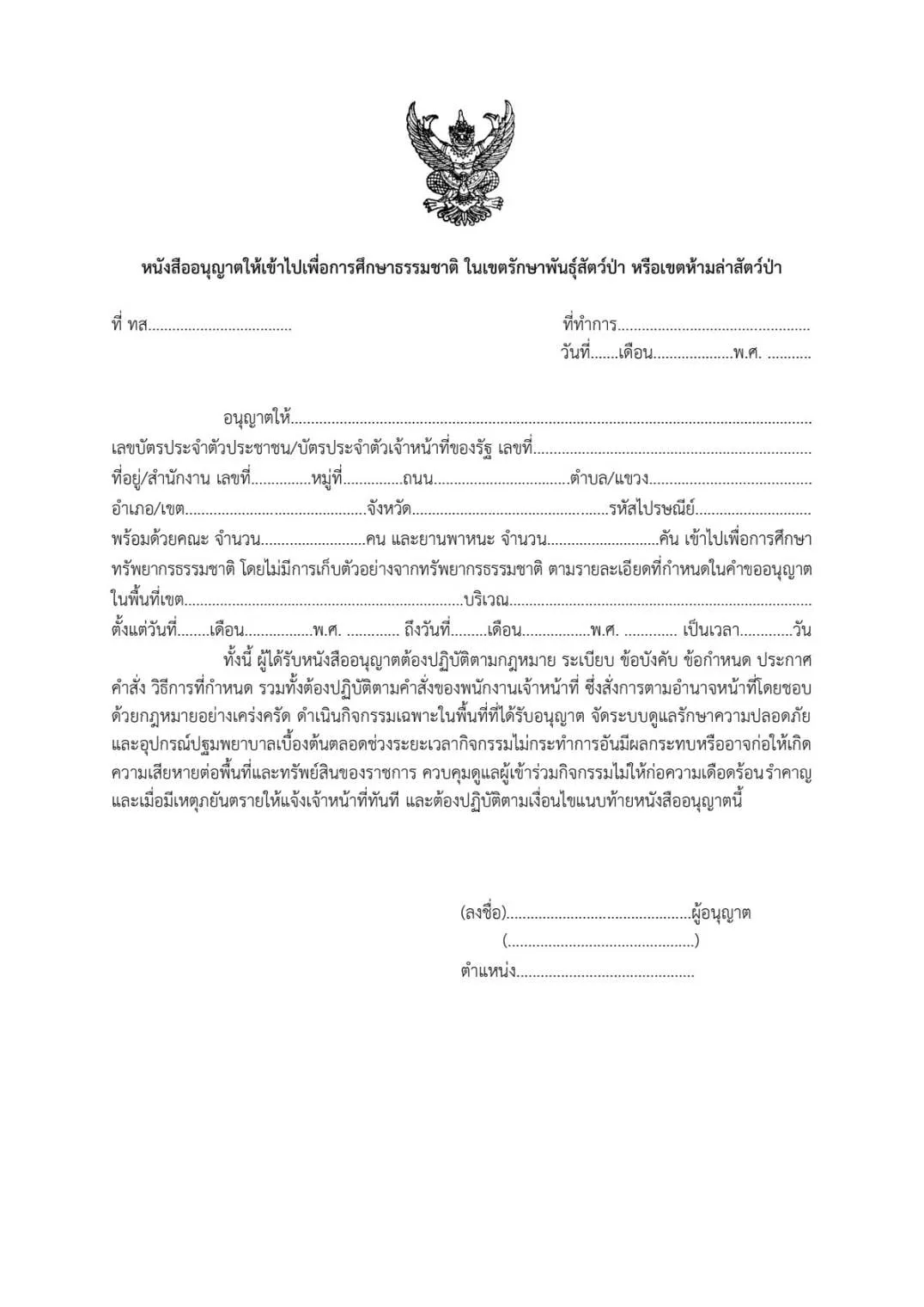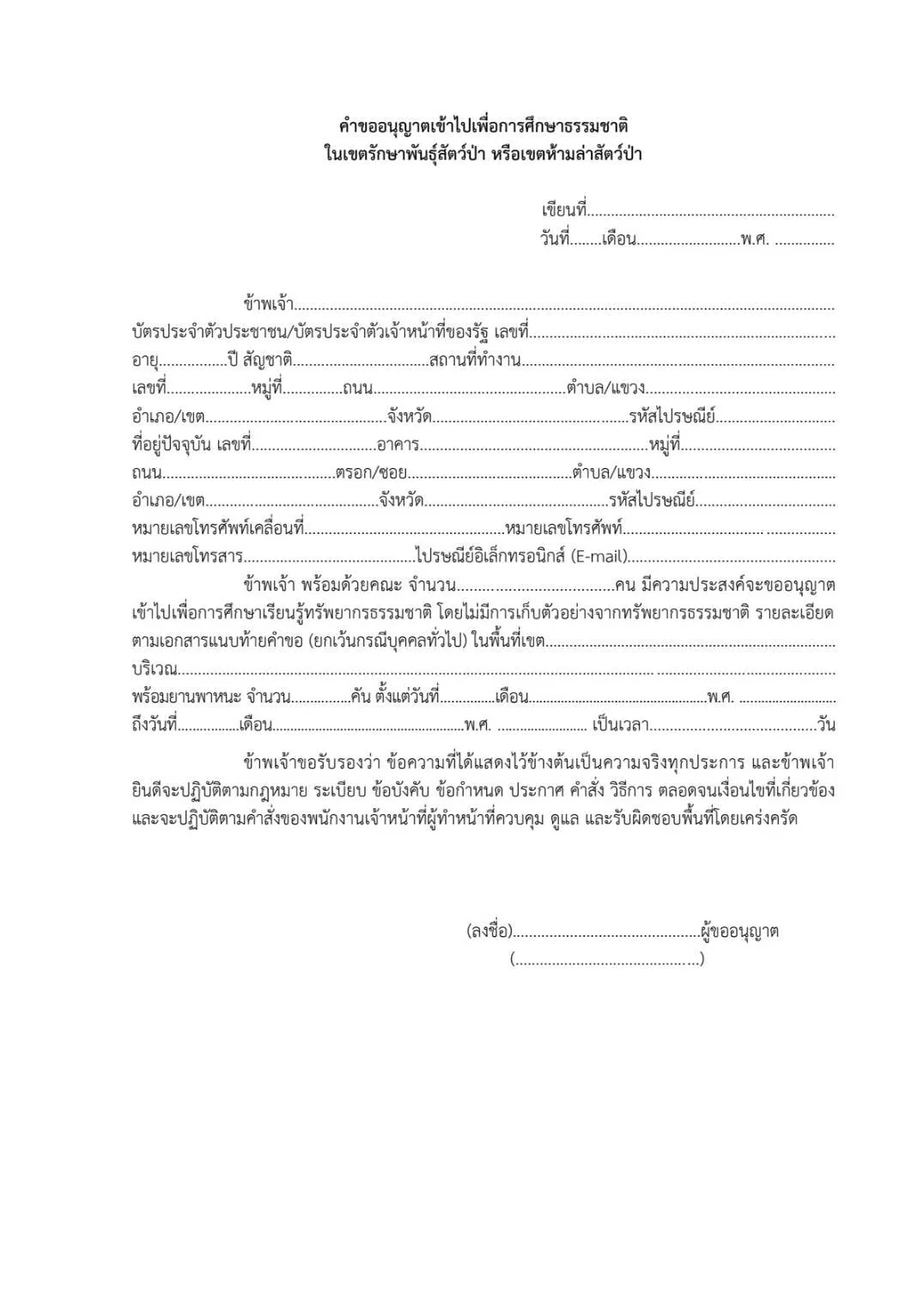 หนังสือขออนุญาตเข้าเขตรักษาพันธุ์สัตว์ป่า