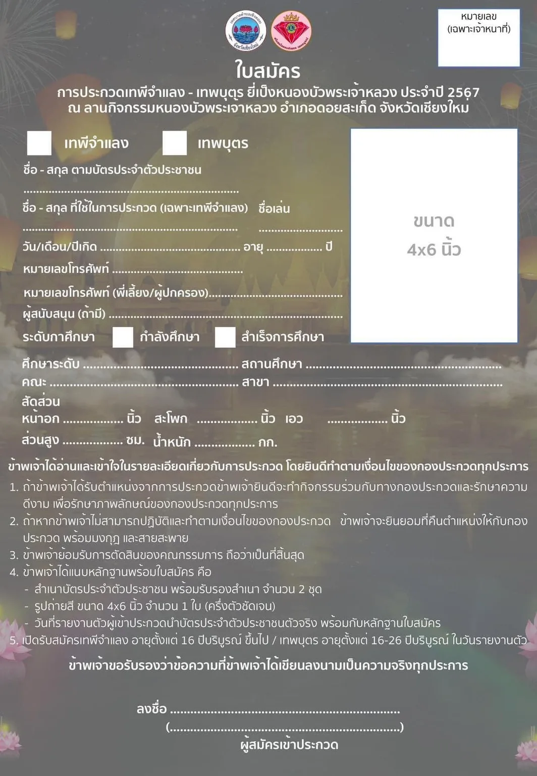 กำหนดจัดเทศกาลโคมล้านนาปู่จาผางประทีปหลวงที่หนองบัวพระเจ้าหลวง 15-18 พฤศจิกายน 2567 อย่าพลาดโอกาสที่จะได้สัมผัสประสบการณ์สุดว้าวที่คุณจะต้องร้องว้าว วันที่ 14 พฤศจิกายนนี้ก็เริ่มแล้ว และพลาดไม่ได้ เตรียมพบกับการประกวดเทพีจำแลงและเทพบุตรยี่เป็งสุดยิ่งใหญ่ ในงานเทศกาลโคมล้านนาปู่จาผางประทีป หนองบัวพระเจ้าหลวง ใครจะคว้ามงกุฎไปครอง ร่วมเป็นส่วนหนึ่งของประสบการณ์สุดพิเศษนี้ ส่งใบสมัครด่วน ก่อนปิดรับสมัคร ส่งใบสมัครได้ที่: Inbox Messenger เทศบาลตำบลเชิงดอย