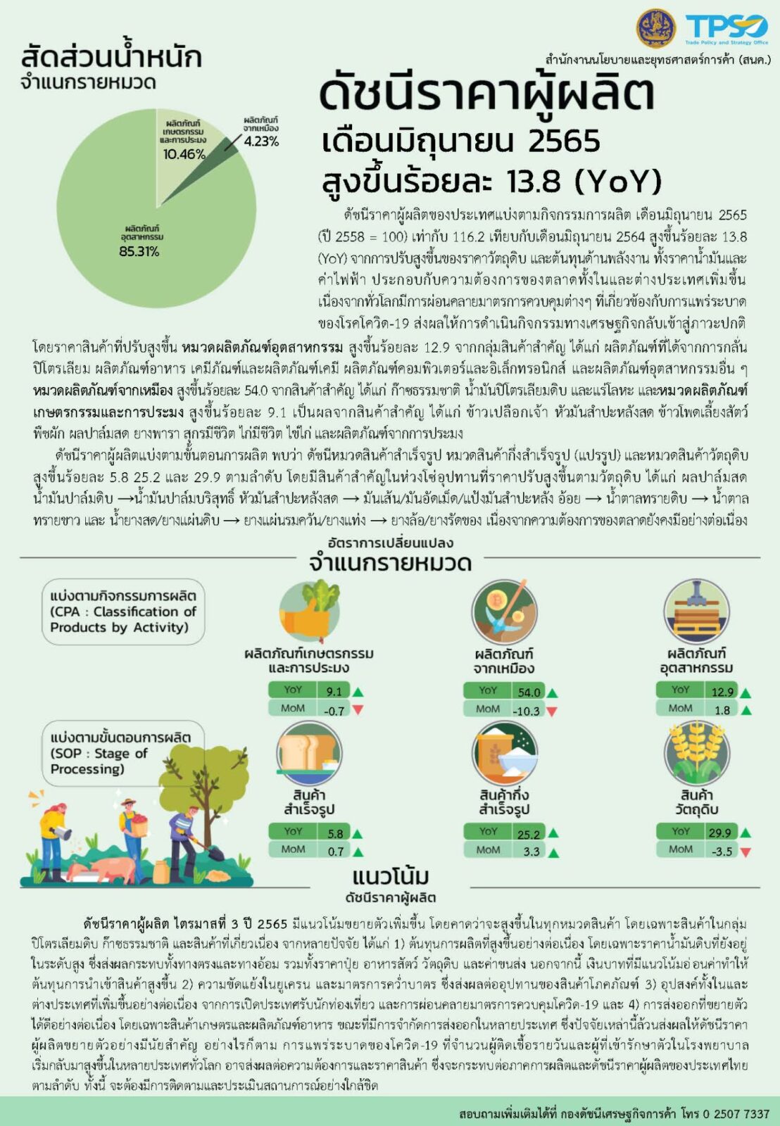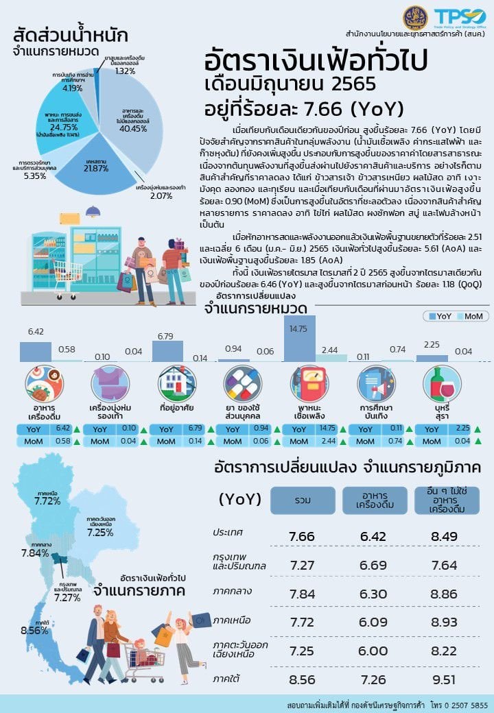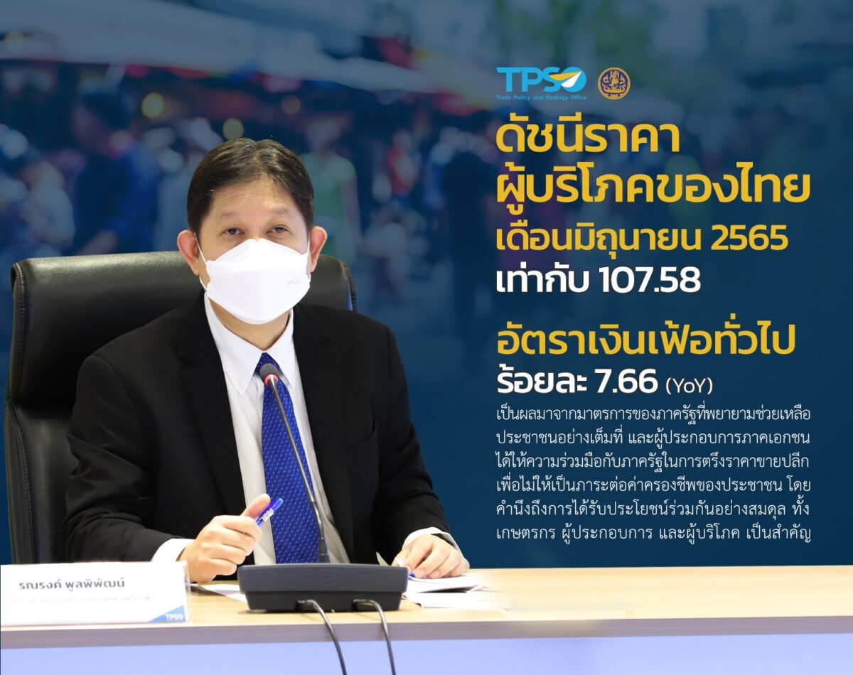นายรณรงค์ พูลพิพัฒน์ ผู้อำนวยการสำนักงานนโยบายและยุทธศาสตร์การค้า เปิดเผยว่า ดัชนีราคาผู้บริโภคของไทย (CPI) เดือนมิถุนายน 2565 เท่ากับ 107.58 เมื่อเทียบกับเดือนพฤษภาคม 2565 (106.62) เพิ่มขึ้นเล็กน้อยที่ร้อยละ 0.90 (MoM) ชะลอตัวลงจากเดือนก่อนหน้าที่สูงขึ้นร้อยละ 1.40 (MoM) ส่งผลให้อัตราเงินเฟ้อทั่วไปในเดือนนี้อยู่ที่ร้อยละ 7.66 (YoY) เมื่อเทียบกับเดือนเดียวกันของปีก่อน ส่วนหนึ่งเป็นผลมาจากมาตรการของภาครัฐที่พยายามช่วยเหลือประชาชนอย่างเต็มที่ และผู้ประกอบการภาคเอกชนได้ให้ความร่วมมือกับภาครัฐในการตรึงราคาขายปลีกเพื่อไม่ให้เป็นภาระต่อค่าครองชีพของประชาชน โดยคำนึงถึงการได้รับประโยชน์ร่วมกันอย่างสมดุล ทั้งเกษตรกร ผู้ประกอบการ และผู้บริโภค เป็นสำคัญ