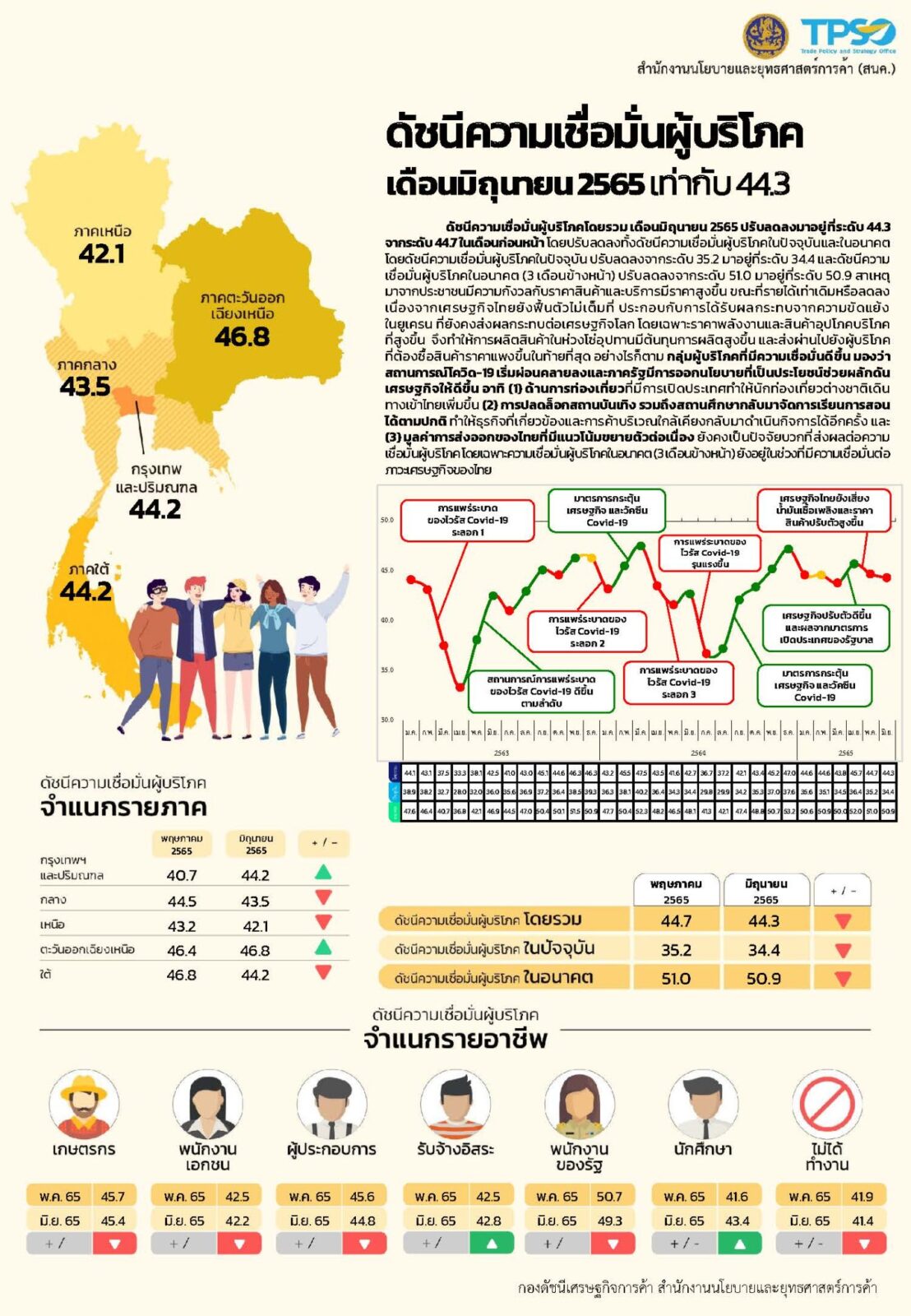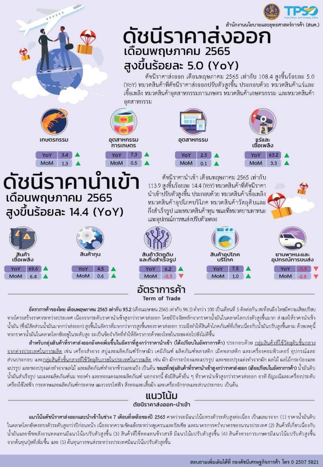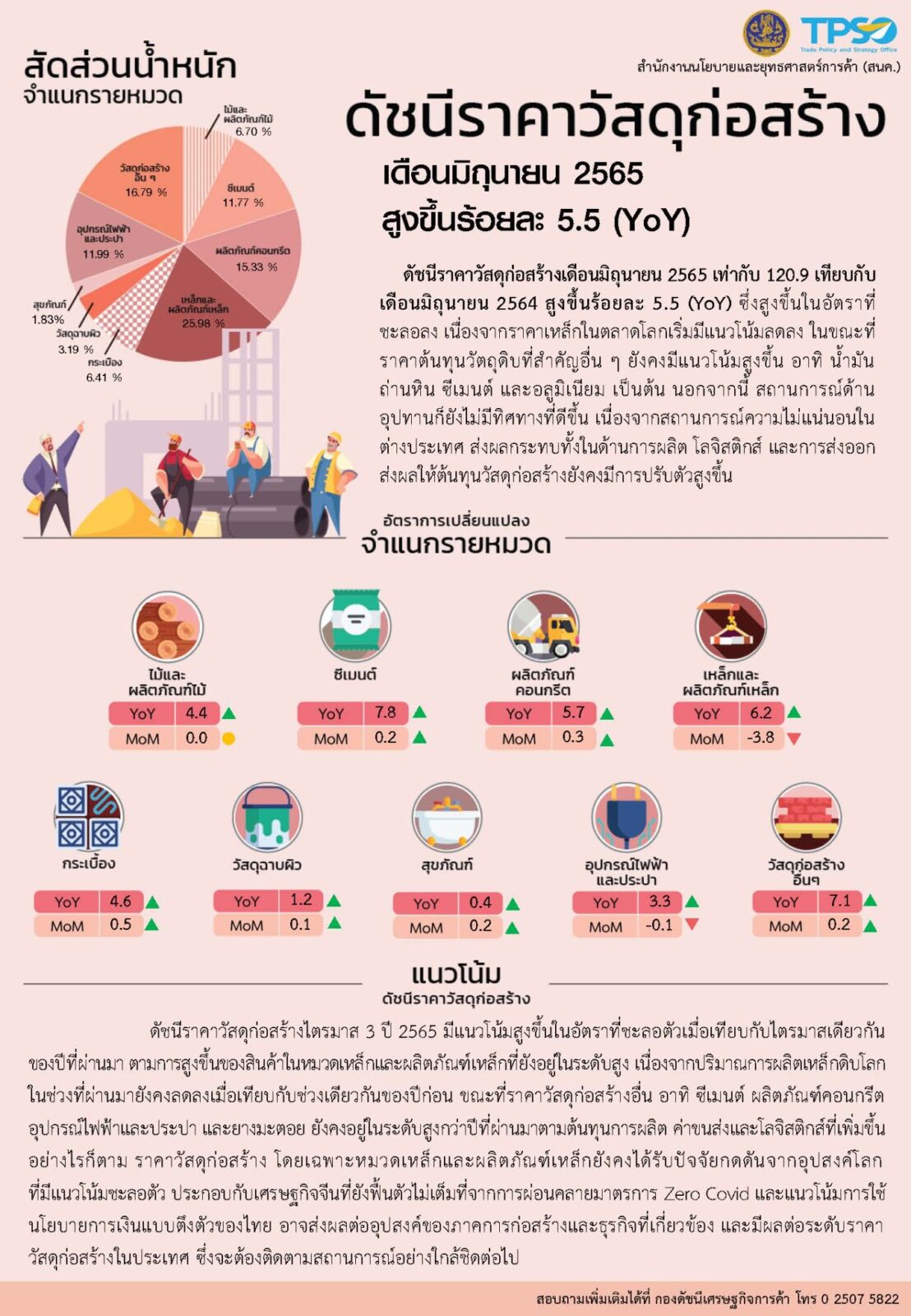 นายรณรงค์ พูลพิพัฒน์ ผู้อำนวยการสำนักงานนโยบายและยุทธศาสตร์การค้า เปิดเผยว่า ดัชนีราคาผู้บริโภคของไทย (CPI) เดือนมิถุนายน 2565 เท่ากับ 107.58 เมื่อเทียบกับเดือนพฤษภาคม 2565 (106.62) เพิ่มขึ้นเล็กน้อยที่ร้อยละ 0.90 (MoM) ชะลอตัวลงจากเดือนก่อนหน้าที่สูงขึ้นร้อยละ 1.40 (MoM) ส่งผลให้อัตราเงินเฟ้อทั่วไปในเดือนนี้อยู่ที่ร้อยละ 7.66 (YoY) เมื่อเทียบกับเดือนเดียวกันของปีก่อน ส่วนหนึ่งเป็นผลมาจากมาตรการของภาครัฐที่พยายามช่วยเหลือประชาชนอย่างเต็มที่ และผู้ประกอบการภาคเอกชนได้ให้ความร่วมมือกับภาครัฐในการตรึงราคาขายปลีกเพื่อไม่ให้เป็นภาระต่อค่าครองชีพของประชาชน โดยคำนึงถึงการได้รับประโยชน์ร่วมกันอย่างสมดุล ทั้งเกษตรกร ผู้ประกอบการ และผู้บริโภค เป็นสำคัญ