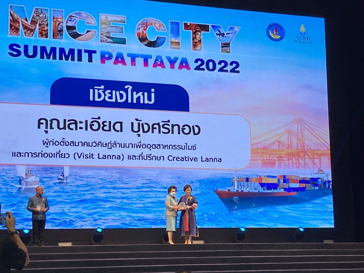 นางละเอียด บุ้งศรีทอง ผู้ก่อตั้งสมาคมวิศิษฏ์ล้านนา เพื่ออุตสาหกรรมไมซ์ (Visit Lanna) เข้าพิธีรับมอบรางวัล “MICE City Ambassador Recognition” โดยรับมอบจาก ดร. อรรชกา สีบุญเรือง ประธานกรรมการส่งเสริมการจัดประชุมและนิทรรศการ สํานักงานส่งเสริมการจัดประชุมและนิทรรศการ องค์การมหาชน (TCEB)