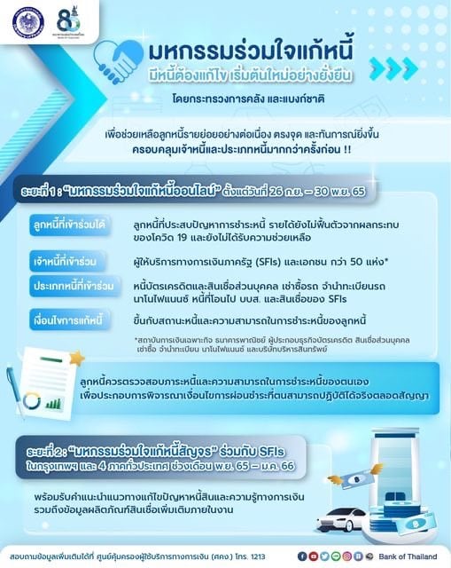 กระทรวงการคลังร่วมกับธนาคารแห่งประเทศไทยจัด “มหกรรมร่วมใจแก้หนี้ : มีหนี้ต้องแก้ไข เริ่มต้นใหม่อย่างยั่งยืน” เพื่อช่วยเหลือลูกหนี้กลุ่มเปราะบางที่รายได้ยังไม่ฟื้นตัวเต็มที่ และอาจได้รับผลกระทบเพิ่มเติมจากค่าครองชีพที่สูงขึ้น