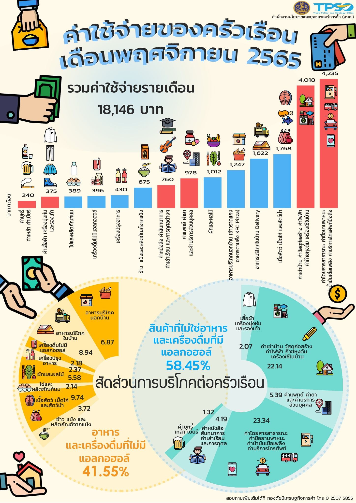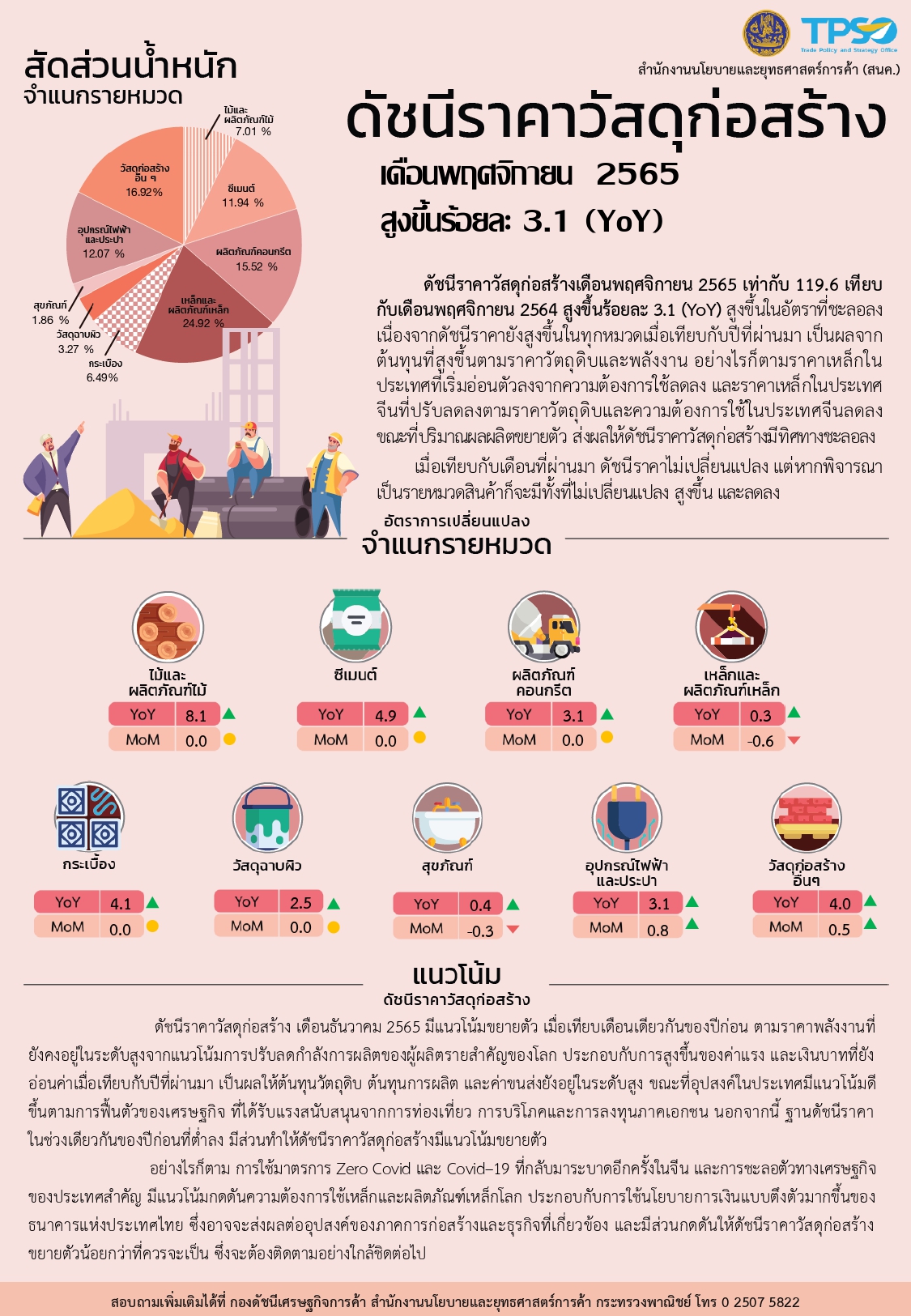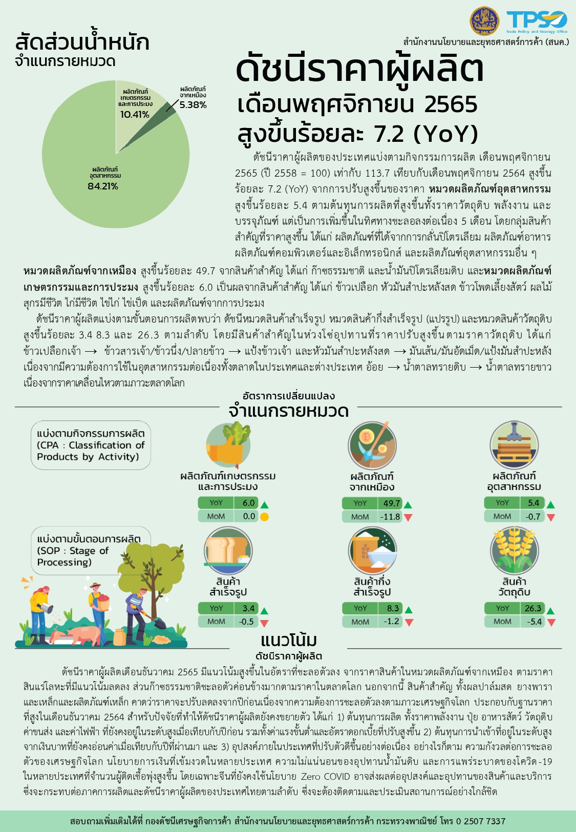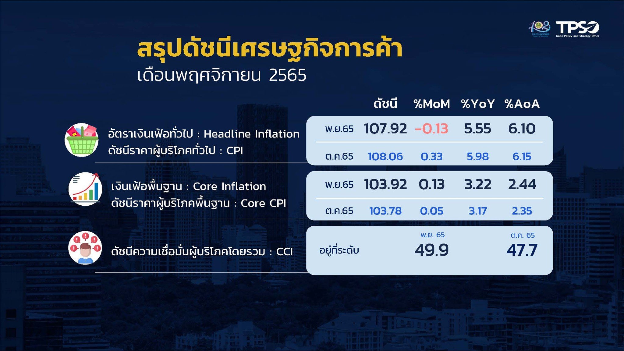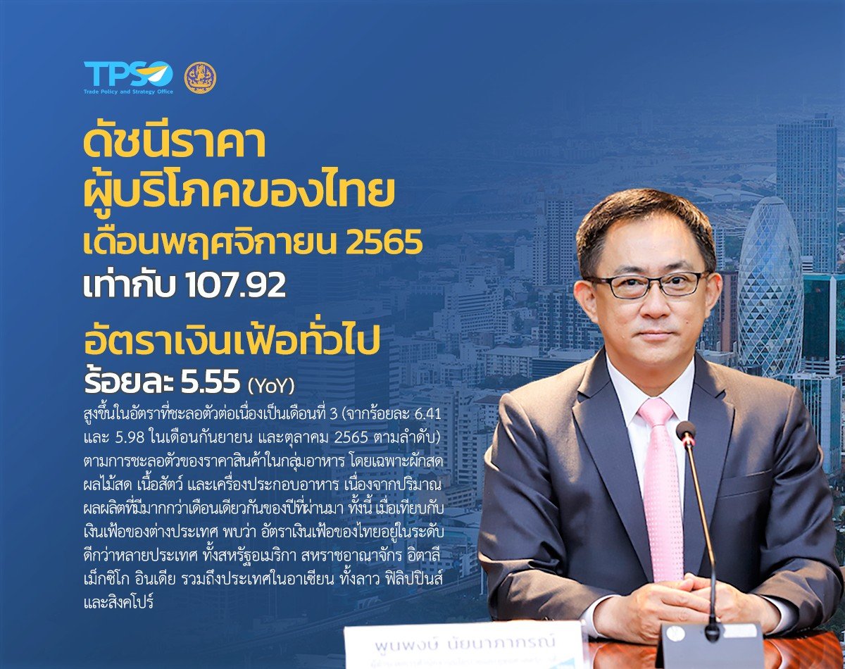 นายพูนพงษ์ นัยนาภากรณ์ ผู้อำนวยการสำนักงานนโยบายและยุทธศาสตร์การค้า เปิดเผยว่า ดัชนีราคาผู้บริโภคของไทย เดือนพฤศจิกายน 2565 เท่ากับ 107.92 เมื่อเทียบกับเดือนเดียวกันของปีก่อน ซึ่งเท่ากับ 102.25 ส่งผลให้อัตราเงินเฟ้อทั่วไป สูงขึ้นร้อยละ 5.55 (YoY) เป็นการสูงขึ้นในอัตราที่ชะลอตัวต่อเนื่องเป็นเดือนที่ 3 (จากร้อยละ 6.41 และ 5.98 ในเดือนกันยายน และตุลาคม 2565 ตามลำดับ) ตามการชะลอตัวของราคาสินค้าในกลุ่มอาหาร โดยเฉพาะผักสด ผลไม้สด เนื้อสัตว์ และเครื่องประกอบอาหาร เนื่องจากปริมาณผลผลิตที่มีมากกว่าเดือนเดียวกันของปีที่ผ่านมา ทั้งนี้ เมื่อเทียบกับเงินเฟ้อของต่างประเทศ (ข้อมูลล่าสุดเดือนตุลาคม 2565) พบว่า อัตราเงินเฟ้อของไทยอยู่ในระดับดีกว่าหลายประเทศ ทั้งสหรัฐอเมริกา สหราชอาณาจักร อิตาลี เม็กซิโก อินเดีย รวมถึงประเทศในอาเซียน ทั้งลาว ฟิลิปปินส์ และสิงคโปร์ โดยมีรายละเอียด ดังนี้