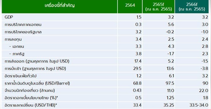 ศูนย์วิจัยกสิกรไทยปรับตัวเลขประมาณการจีดีพีปี 2566 มาที่ร้อยละ 3.2 จากเดิมที่อยู่ในกรอบร้อยละ 3.2-4.2 แม้ว่าจะปรับเพิ่มประมาณการจีดีพีสำหรับทั้งปี 2565 จากร้อยละ 2.9 มาที่ร้อยละ 3.2 ก็ตาม
