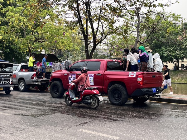 ล่าสุดช่วงบ่ายวันนี้ (12 เม.ย.66) นักท่องเที่ยวกลุ่มคาราวานรถยนต์จากจีนส่วนหนึ่ง ที่เดินทางมาถึง จ.เชียงใหม่เย็นวานนี้ ได้ใช้รถยนต์กระบะบรรทุกนักท่องเที่ยวจีน พร้อมอุปกรณ์ในการเล่นสาดน้ำ และรถยนต์ชนิดอื่นขับติดตามกันมา เพื่อเดินทางไปรอบคูเมืองเชียงใหม่ ที่เป็นไฮไลท์ในการเล่นสาดน้ำในช่วงเทศกาลสงกรานต์ของทุกปี และถึงแม้ว่าวันนี้บริเวณดังกล่าว ยังไม่มีการเล่นสาดน้ำอย่างเป็นทางการ คงมีเพียงการเตรียมจับจองพื้นที่ขายสินค้าเกี่ยวกับการเล่นสาดน้ำในเทศกาลนี้ และมีประชาชนนักท่องเที่ยวบางส่วนเท่านั้น ที่เริ่มเล่นสาดน้ำบริเวณคูเมือง เนื่องจากจะเริ่มสาดกันเต็มที่ในวันพรุ่งนี้ หรือระหว่างวันที่ 13-15 เมษายน