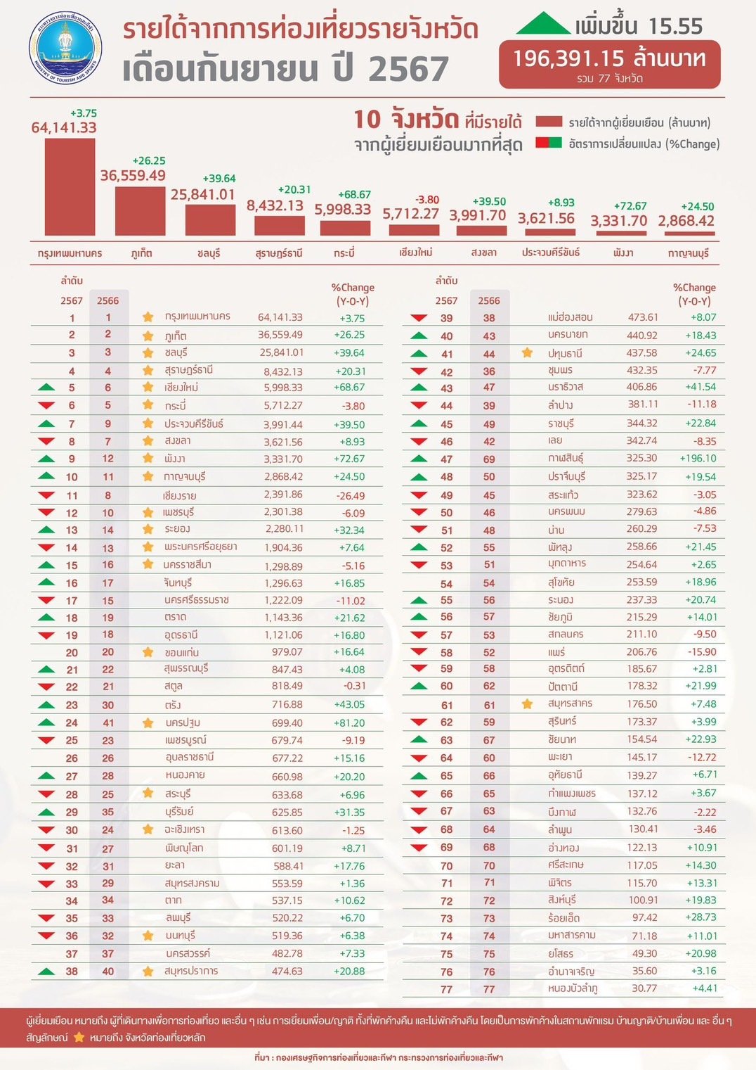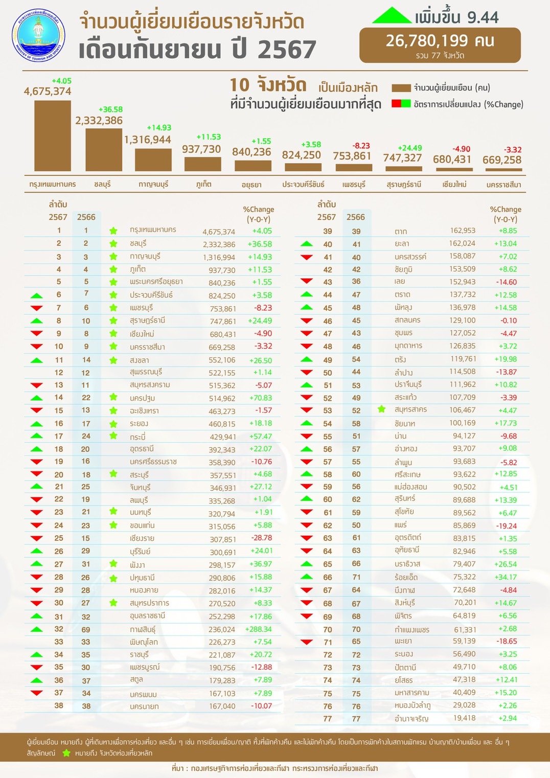 วันที่ 1 พฤศจิกายน 2567 กองเศรษฐกิจการท่องเที่ยวและกีฬา ได้เปิดเผยข้อมูลจำนวนนักท่องเที่ยวและรายได้จากการท่องเที่ยวรายจังหวัด ประจำเดือนกันยายน พ.ศ. 2567 โดยจำนวนผู้เยี่ยมเยือนรายจังหวัด รวม 77 จังหวัด มีจำนวน 26,780,199 คน ขยายตัวร้อยละ 9.44 เมื่อเปรียบเทียบกับช่วงเวลาเดียวกันของปีที่ผ่านมา ขณะที่ รายได้จากผู้เยี่ยมเยือน รวม 77 จังหวัด มีจำนวน 196,391.15 ล้านบาท ขยายตัวร้อยละ 15.55 เมื่อเปรียบเทียบกับช่วงเวลาเดียวกันของปีที่ผ่านมา