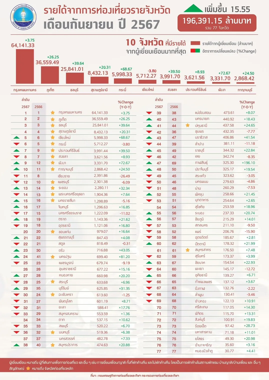 วันที่ 1 พฤศจิกายน 2567 กองเศรษฐกิจการท่องเที่ยวและกีฬา ได้เปิดเผยข้อมูลจำนวนนักท่องเที่ยวและรายได้จากการท่องเที่ยวรายจังหวัด ประจำเดือนกันยายน พ.ศ. 2567 โดยจำนวนผู้เยี่ยมเยือนรายจังหวัด รวม 77 จังหวัด มีจำนวน 26,780,199 คน ขยายตัวร้อยละ 9.44 เมื่อเปรียบเทียบกับช่วงเวลาเดียวกันของปีที่ผ่านมา ขณะที่ รายได้จากผู้เยี่ยมเยือน รวม 77 จังหวัด มีจำนวน 196,391.15 ล้านบาท ขยายตัวร้อยละ 15.55 เมื่อเปรียบเทียบกับช่วงเวลาเดียวกันของปีที่ผ่านมา