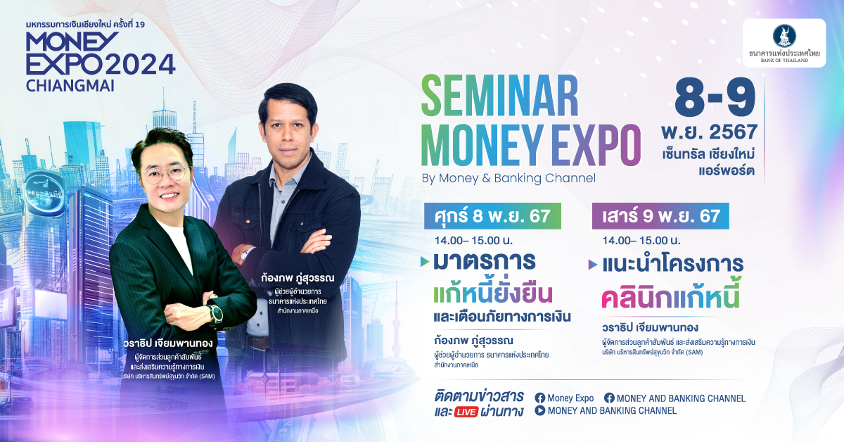 นอกจากนี้ ภายในงานยังมีกิจกรรมสัมมนาให้ความรู้แก่ประชาชนและนักลงทุน ในหัวข้อ “มาตรการแก้หนี้ยั่งยืน และเตือนภัยทางการเงิน” วิทยากรโดย นายก้องภพ ภู่สุวรรณ ผู้ช่วยผู้อำนวยการธนาคารแห่งประเทศไทย สำนักงานภาคเหนือ ในวันศุกร์ที่ 8 พฤศจิกายน 2567 เวลา 14.00-15.00 น. และหัวข้อ “แนะนำโครงการคลินิกแก้หนี้” วิทยากรโดย นายวราธิป เจียมพานทอง ผู้จัดการส่วนลูกค้าสัมพันธ์และส่งเสริมความรู้ทางการเงิน บริษัท บริหารสินทรัพย์สุขุมวิท จำกัด ในวันเสาร์ที่ 9 พฤศจิกายน 2567 เวลา14.00-15.00 น.ณ เวทีสัมมนา เชียงใหม่ฮอลล์ เซ็นทรัล เชียงใหม่ แอร์พอร์ต หรือรับชมในรูปแบบ LIVE ทางแฟนเพจ Money Expo, Money and Banking Channel และการเงินธนาคาร