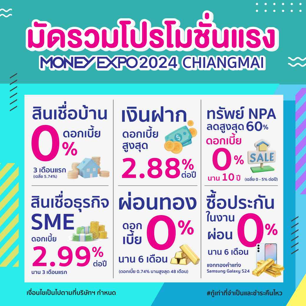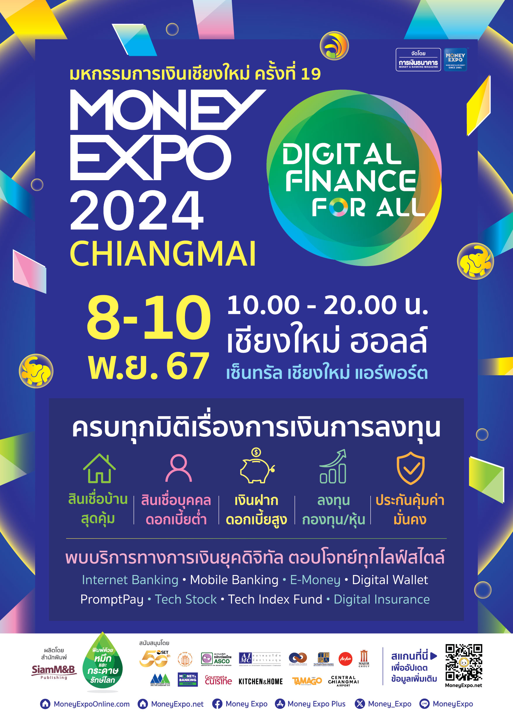แบงก์-นอนแบงก์-ประกัน-บล.-บลจ. บุกเสนอบริการทางการเงินการลงทุนครบวงจร อัดโปรโมชั่นแรงท้าลมหนาว เพื่อลูกค้าและผู้ประกอบการเอสเอ็มอีชาวเชียงใหม่และภาคเหนือ รับไฮซีซันส่งท้ายปี ในงานมหกรรมการเงินเชียงใหม่ ครั้งที่ 19 MONEY EXPO 2024 CHIANGMAI สินเชื่อบ้าน 0% นาน 3 เดือนแรก เงินฝากดอกเบี้ยสูง 2.88% ต่อปี สินเชื่อธุรกิจ SME ดอกเบี้ย 2.99% ต่อปี นาน 3 เดือนแรก ทรัพย์ NPA ลดสูงสุด 60% สินเชื่อบุคคล ดอกเบี้ย 5.55% ต่อปี ซื้อประกันในงาน ผ่อน 0% นาน 6 เดือน แจกทองคำแท่ง/Samsung Galaxy S24 พร้อมฟังสัมมนาฟรีจากกูรูด้านการลงทุน วันที่ 8-10 พฤศจิกายน 2567 ณ เชียงใหม่ ฮอลล์ ศูนย์การค้าเซ็นทรัล เชียงใหม่ แอร์พอร์ต จังหวัดเชียงใหม่