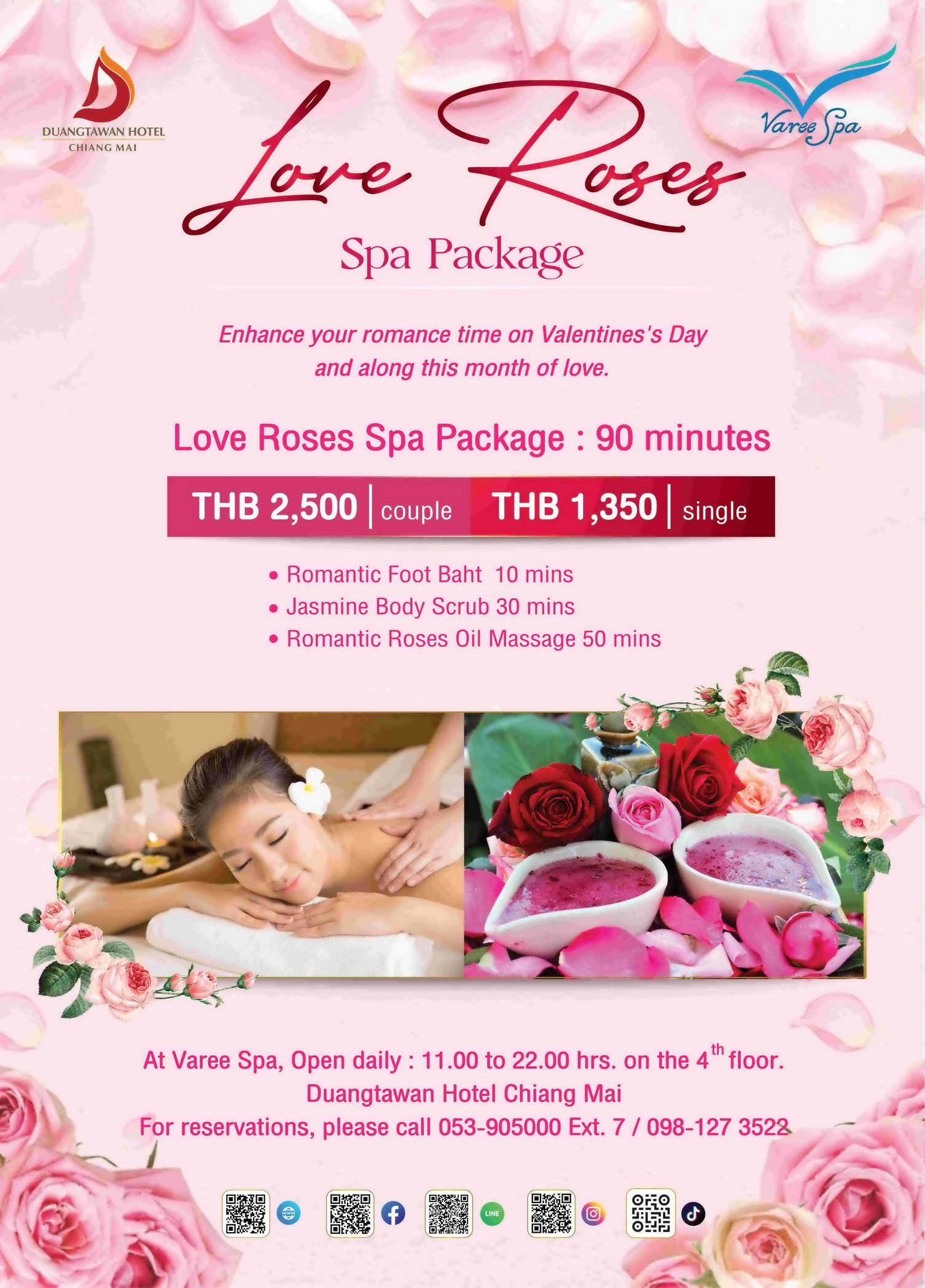 Enhance your romance time on Valentines’s Day and along this month of love, February. Love Roses Spa Package: 90 minutes at THB 2,500 for couple / THB 1,350 for single.*Romantic Foot Baht 10 mins * Body Scrub 30 mins * Romantic Roses Oil Massage 50 mins. Open daily: 11.00 to 22.00 hrs. at Varee Spa, on the 4th floor. Duangtawan Hotel Chiang Mai. For reservations, please call 053-905000 Ext. 7