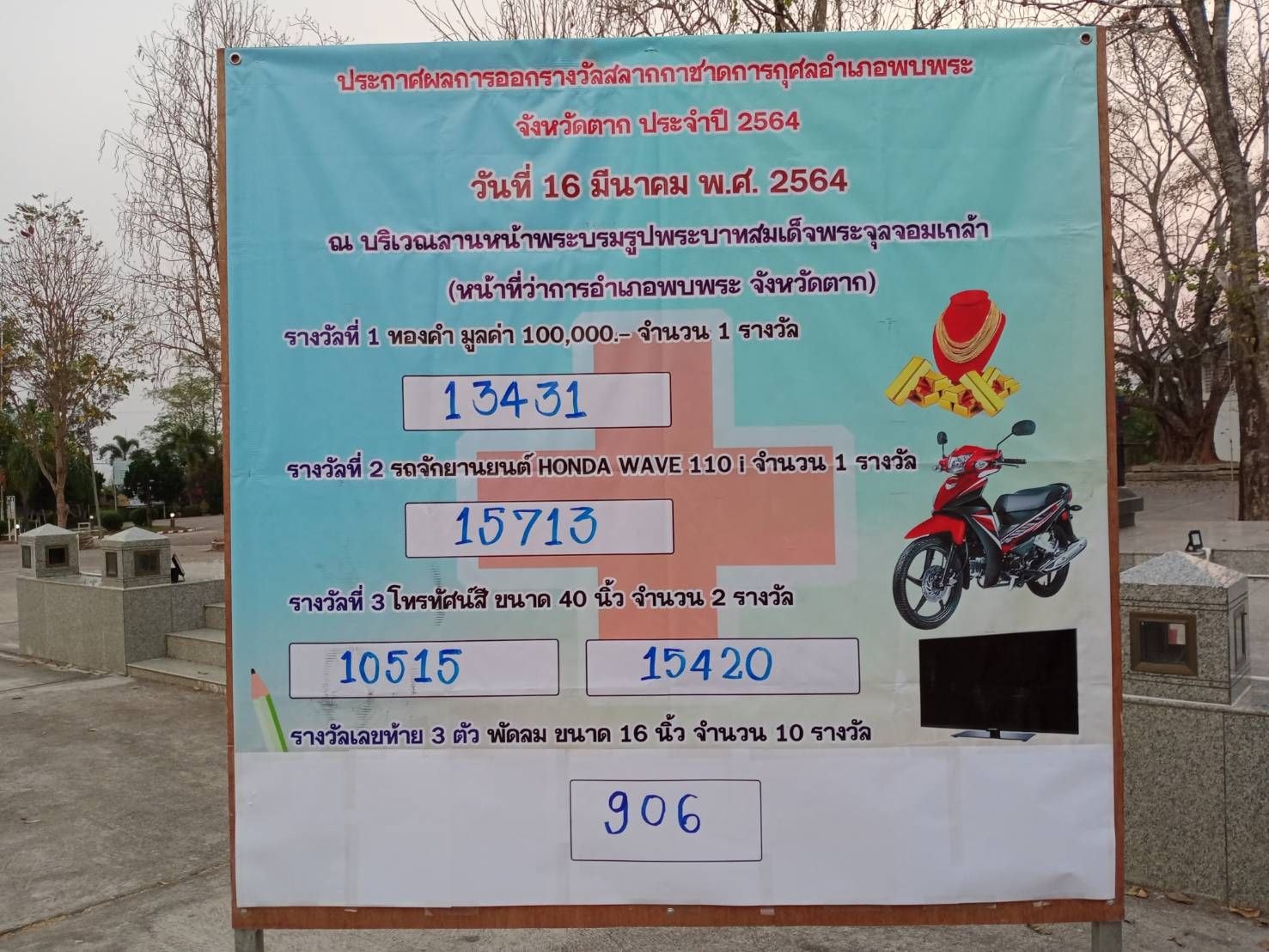 ทั้งนี้ท่านสามารถติดตามตรวจผลรางวัลอื่นๆ นอกจากนี้ได้ที่ Facebook ที่ว่าการอำเภอพบพระ, ที่ว่าการอำเภอพบพระ สำนักงานกิ่งกาชาดอำเภอพบพระ โทร. 055-569104 ติดต่อรับรางวัลได้ที่กลุ่มงานการเงินและบัญชี ที่ทำการปกครองอำเภอพบพระ ชั้น2 ภายใน 60 วัน นับแต่วันออกรางวัล (ภายใน 16 พฤษภาคม 2564) กิจกรรมดังกล่าวจัดไปเมื่อค่ำวันที่ 16 มี.ค.2564 ที่ผ่านมา