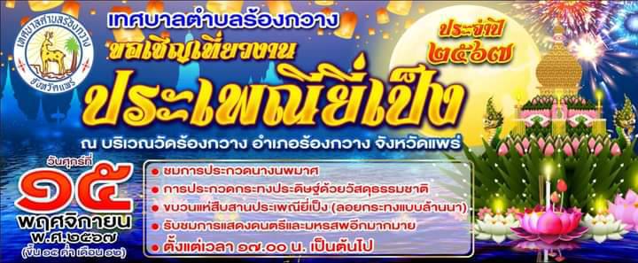 นายพิพัฒน์ ซี่อทรงธรรม นายก ทต.ร้องกวาง อ.ร้องกวาง จ แพร่ เผยว่า ทต.ร้องกวาง ขอเชิญเที่ยวงานส่งเสริมประเพณียี่เป็งประจำปี 2567 ในวันศุกร์ที่ 15 พฤศจิกายน 2567 ณ วัดร้องกวาง .ร้องกวาง พร้อมชมขบวนแห่นางนพมาศ การประกวดนางนพมาศร้องกวาง ประจำปี 2567 การประกวดกระทงประดิษฐ์จากวัสดุธรรมชาติ และชมการแสดงดนตรีสดฟรีตลอดงาน
