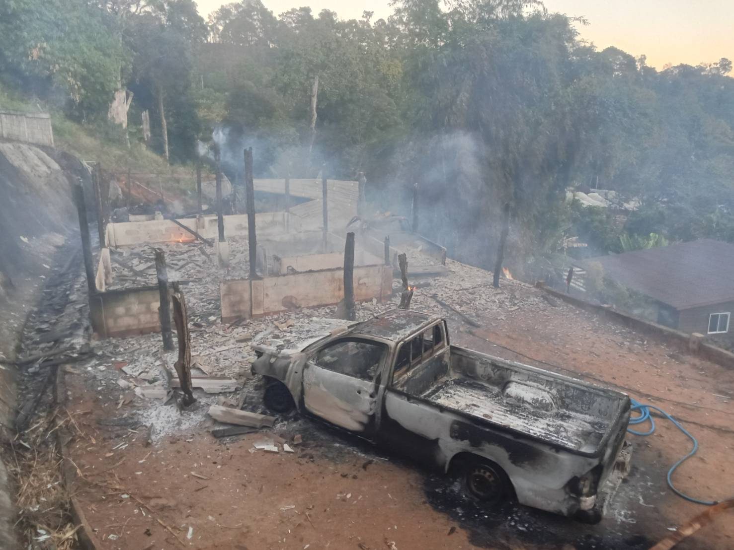 เพลิงไหม้บ้านแต่เช้ามืด พื้นที่บ้านขุนวาง อ.แม่วาง รถดับเพลิง อบต.แม่วิน ร่วมชาวบ้านช่วยกันดับ พบบ้านเสียหายทั้งหลัง รถยนต์อีก 2 คัน เจ้าของบ้านบาดเจ็บเล็กน้อย