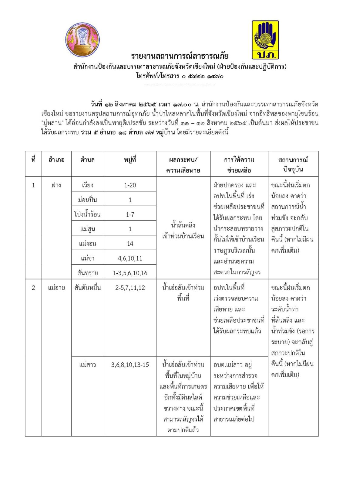 วันที่ 12 ส.ค. 65 เวลา 17.00 น. สนง.ปภ.จังหวัดเชียงใหม่ สรุปสถานการณ์อุทกภัย น้ำป่าไหลหลากในพื้นที่จังหวัดเชียงใหม่ จากอิทธิพลของพายุโซนร้อน “มู่หลาน” ได้อ่อนกำลังลงเป็นพายุดิเปรสชั่น ระหว่างวันที่ 11 – 12 สิงหาคม 2565 เป็นต้นมา ส่งผลให้ประชาชนได้รับผลกระทบ รวม 5 อำเภอ 18 ตำบล 77 หมู่บ้าน ประกอบด้วย
