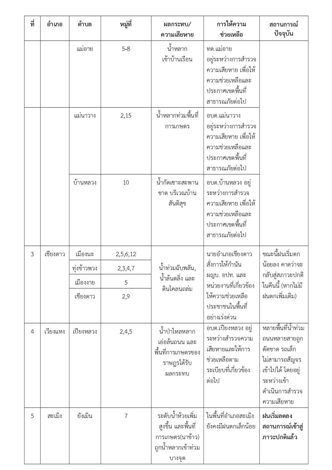 ตำบลแม่อาย หมู่ที่ 5-8 เทศบาลตำบลแม่อาย อยู่ระหว่างการสำรวจและตรวจสอบความเสียหาย เพื่อให้ความช่วยเหลือและประกาศเขตพื้นที่สาธารณภัยต่อไป