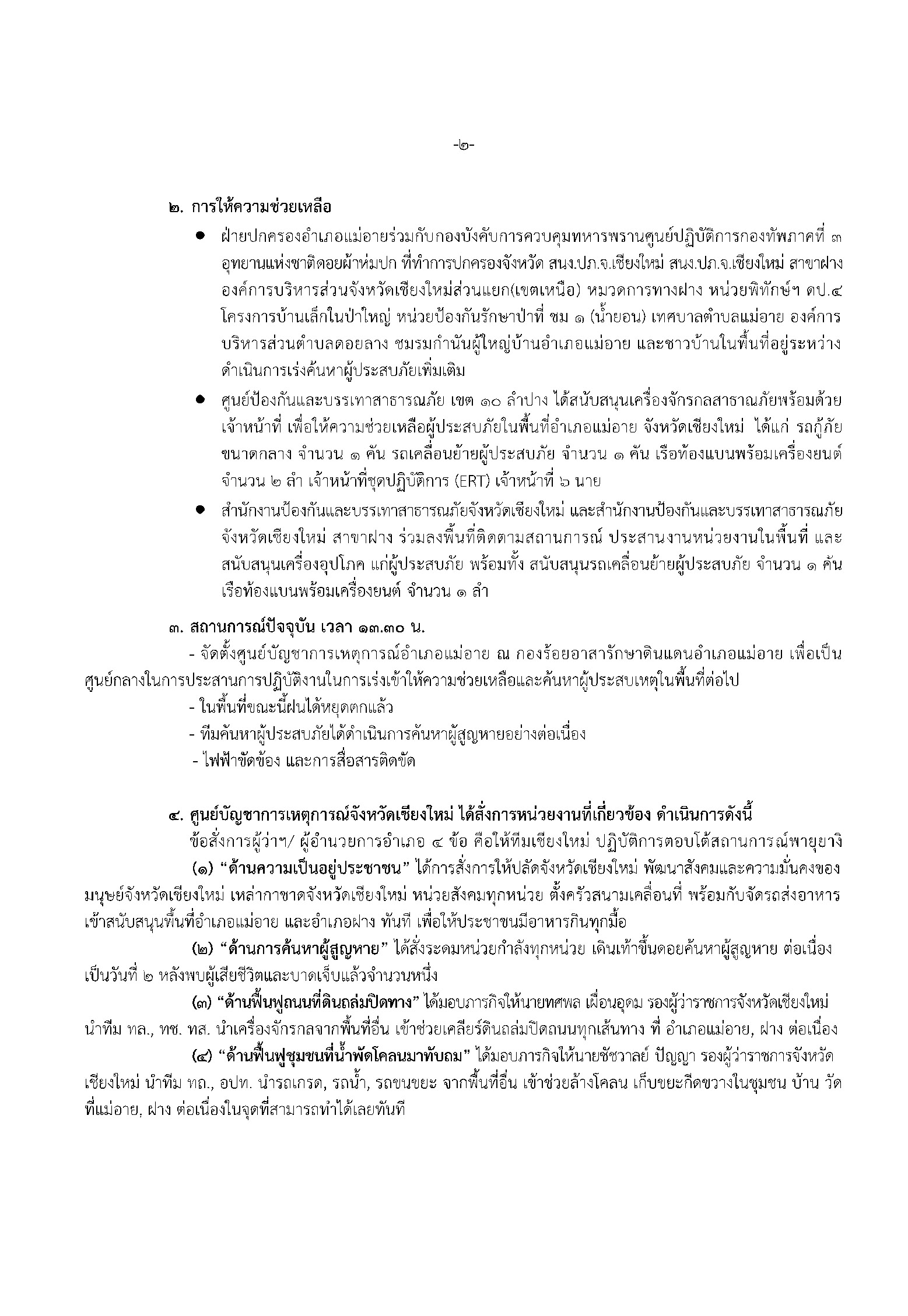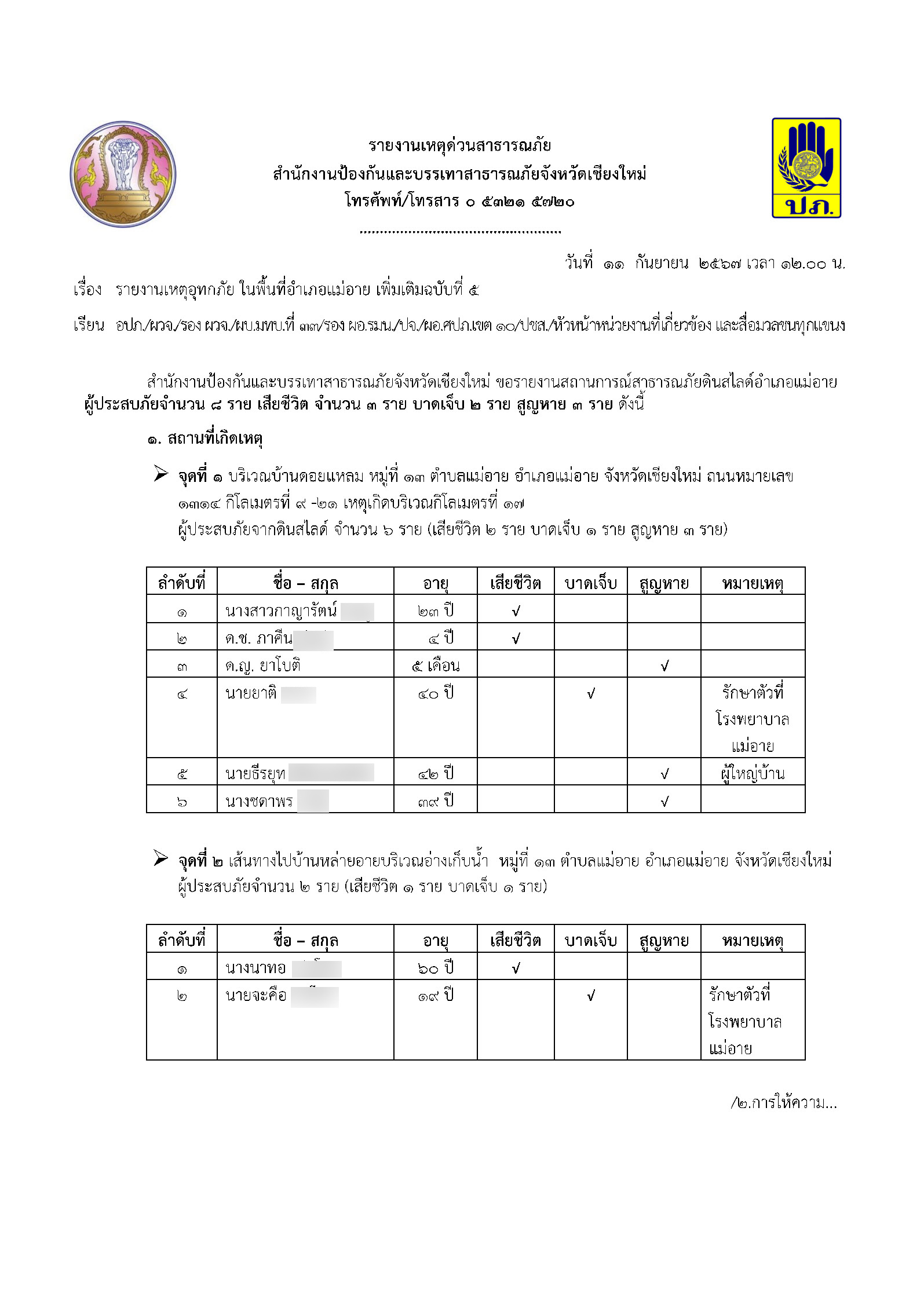1.2 จุดที่ 2 ราษฎรสูญหาย จำนวน 2 ราย เส้นทางไปบ้านหล่ายอาย บริเวณอ่างเก็บน้ำ พบผู้เสียชีวิต จำนวน 1 ราย ไม่ทราบชื่อ และผู้บาดเจ็บ 1 ราย ทราบชื่อคือนายจะคือ อายุ 19 ปี (รักษาตัวที่โรงพยาบาลแม่อาย)