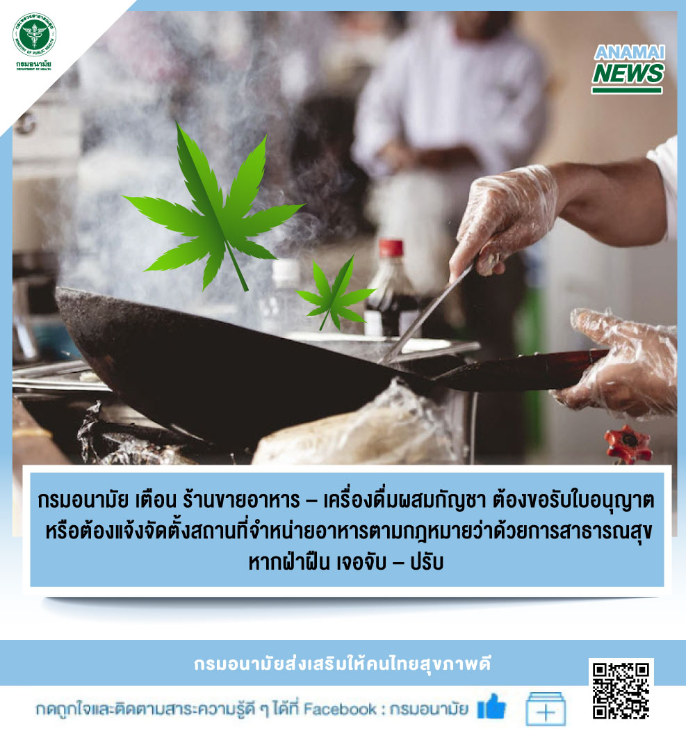 กรมอนามัย กระทรวงสาธารณสุข เตือน ร้านอาหารที่มีการทำ ปรุง หรือประกอบอาหาร และจำหน่ายอาหารหรือเครื่องดื่มที่ผสมกัญชา ก่อนที่จะนำอาหารไปจำหน่ายแบบออนไลน์ หรือจำหน่ายให้ผู้บริโภคผ่านช่องทางต่าง ๆ ต้องขอรับใบอนุญาตหรือขอรับหนังสือรับรองการแจ้งจัดตั้งสถานที่จำหน่ายอาหารจากเจ้าพนักงานท้องถิ่น ซึ่งเป็นที่ตั้งของสถานที่จำหน่ายอาหารหรือสถานที่ที่มีการทำ ปรุง หรือประกอบอาหารเพื่อจำหน่าย หากไม่ได้รับใบอนุญาตหรือไม่ได้แจ้ง ต้องระวางโทษปรับ หรือจำคุก