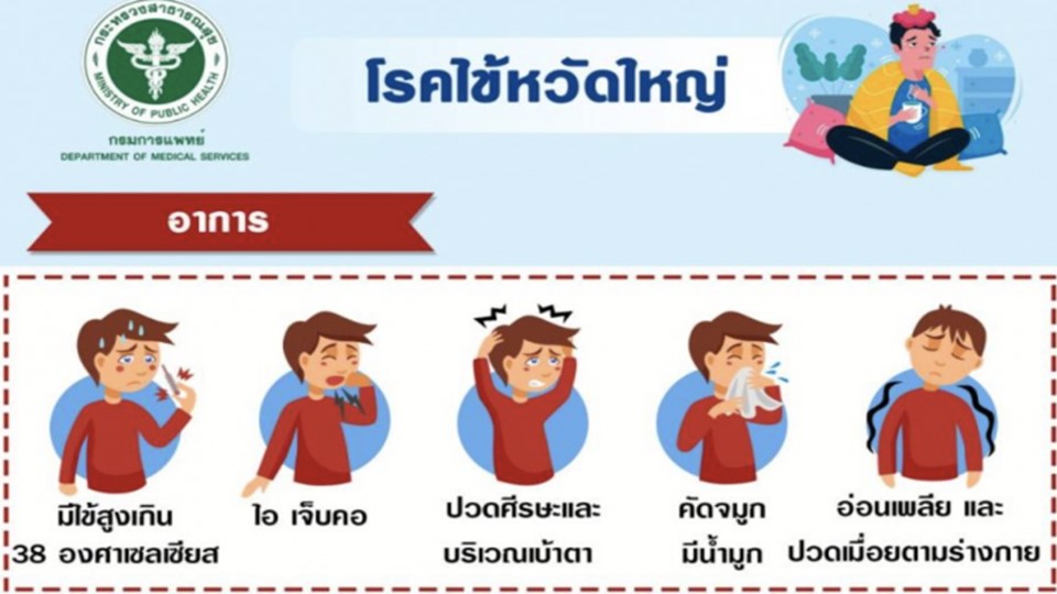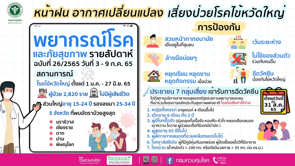 จากข้อมูลของกรมควบคุมโรค กระทรวงสาธารณสุข พบว่า สถานการณ์โรคไข้หวัดใหญ่ในปีนี้ ตั้งแต่วันที่ 1 มกราคม – 27 มิถุนายน 2565 มีรายงานพบผู้ป่วย 2,820 ราย ไม่มีผู้เสียชีวิต กลุ่มอายุที่พบผู้ป่วยมากที่สุดคือ อายุ 15-24 ปี (ร้อยละ 11.45) รองลงมาคือ กลุ่มอายุ 25-34 ปี (ร้อยละ 10.11) และกลุ่มเด็กแรกเกิด – 1 ปี (ร้อยละ 9.93) จังหวัดที่มีอัตราป่วยสูงสุด 5 อันดับแรก ได้แก่ นราธิวาส เชียงราย ตาก น่าน และพิษณุโลก ตามลำดับ จากรายงานผู้ป่วยมีแนวโน้มเพิ่มขึ้น และจากการเฝ้าระวังเหตุการณ์จากโปรแกรมตรวจสอบข่าวการระบาด ของกรมควบคุมโรค มีรายงานเหตุการณ์ การระบาดของโรคไข้หวัดใหญ่สะสม 2 เหตุการณ์ ได้แก่
