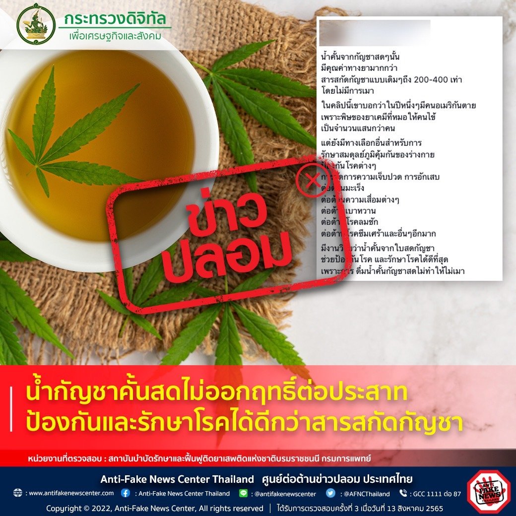 กรณีที่มีข้อความแนะนำบนสื่อสังคมออนไลน์เกี่ยวกับประเด็นเรื่องน้ำกัญชาคั้นสดไม่ออกฤทธิ์ต่อประสาท ป้องกันและรักษาโรคได้ดีกว่าสารสกัดกัญชา ทางศูนย์ต่อต้านข่าวปลอม กระทรวงดิจิทัลเพื่อเศรษฐกิจและสังคม ได้ตรวจสอบข้อเท็จจริงกับสถาบันบำบัดรักษาและฟื้นฟูติดยาเสพติดแห่งชาติบรมราชชนนี กรมการแพทย์ พบว่าข้อมูลดังกล่าวนั้น เป็นข้อมูลเท็จ