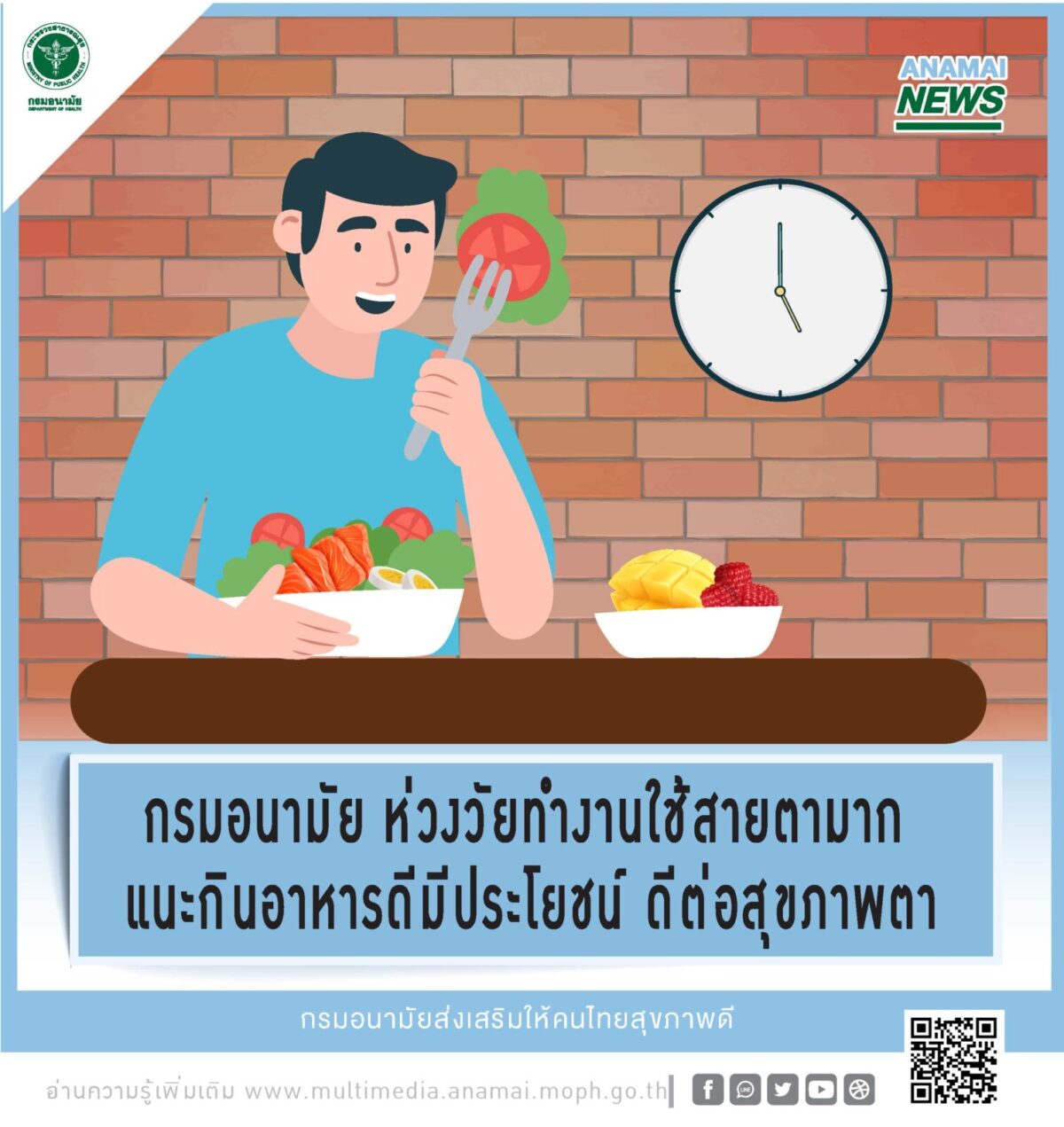 นายแพทย์มณเฑียร คณาสวัสดิ์ รองอธิบดีกรมอนามัย กล่าวว่า ในสังคมยุคดิจิทัลที่แต่ละวันกลุ่มคนวัยทำงานต้องอยู่กับหน้าจอคอมพิวเตอร์ สมาร์ทโฟน แท็บเล็ต เป็นเวลานานติดต่อกัน อาจทำให้ได้รับผลกระทบ เช่น ภาวะตาล้า ตาแห้ง ตาพร่า น้ำตาไหล หรือร้ายแรงกว่านั้นอาจเสี่ยงกับโรคจอประสาทตาเสื่อม โดยเฉพาะผู้ที่นั่งหน้าจอคอมพิวเตอร์นานวันละ 10 ชั่วโมง ควรดูแลรักษาและใช้สายตาให้เหมาะสม โดยหยุดพักสายตาจากจอคอมพิวเตอร์ ทุก 2 ชั่วโมง ครั้งละประมาณ 15 นาที นอกจากนี้ ควรกินอาหารที่ดี มีประโยชน์ และอุดมไปด้วยสารอาหาร ที่ช่วยบำรุงสุขภาพตา เช่น วิตามินเอ วิตามินซี ลูทีน ซีแซนทีน กรดไขมัน ที่มีความสำคัญต่อการมองเห็น โดยได้รับจากอาหารต่าง ๆ ดังนี้ 1) ผัก ผลไม้หลากสี โดยเฉพาะผักใบเขียวที่อุดมด้วยวิตามินเอ เช่น ผักบุ้ง บรอกโคลี คะน้า ตำลึง ผักโขม ปวยเล้ง กวางตุ้ง ดอกกุยช่าย ขึ้นฉ่าย ช่วยให้การทำงานของเซลล์จอประสาทตาทำงานได้อย่างมีประสิทธิภาพ ผัก ผลไม้สีม่วง จะมีสารแอนโธไซยานินช่วยในการมองเห็น ผัก ผลไม้สีเหลือง แดง มีสารจำพวกแคโรทีนอยด์ หรือ Pro-Vitamin A ซึ่งจะถูกเปลี่ยนเป็นวิตามินเอภายในร่างกาย นอกจากนี้ ผัก ผลไม้หลากสี ยังอุดมด้วยวิตามินซีและสารต้านอนุมูลอิสระที่จะช่วยชะลอความเสื่อมของเซลล์ อาหารบำรุงสายตาที่มีสีสันเหล่านี้ ได้แก่ มะเขือเทศ แครอท ฟักทอง ผลไม้ตระกูลเบอร์รี่ มะม่วงสุก มะละกอสุก เป็นต้น