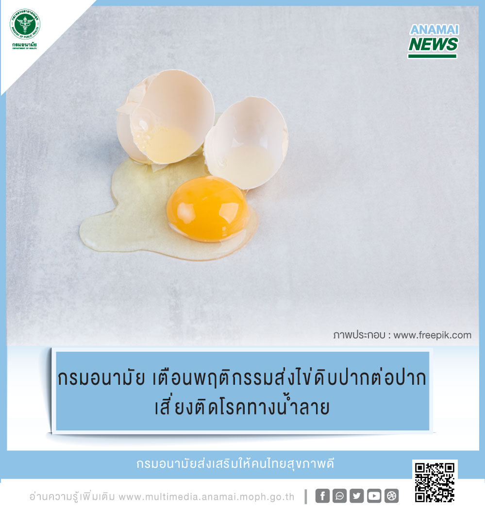 กรมอนามัย กระทรวงสาธารณสุข เตือนกินไข่ดิบส่งต่อปากต่อปาก เสี่ยงปนเปื้อนเชื้อจุลินทรีย์อันตราย และโรคติดต่อทางน้ำลาย แนะเลี่ยงพฤติกรรมเสี่ยง