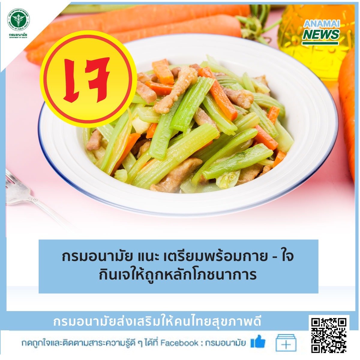 “ทั้งนี้ ก่อนกินเจ 2 – 3 วัน ควรเตรียมความพร้อมของร่างกายและจิตใจ โดยให้ระบบทางเดินอาหารค่อยๆ ปรับสภาพ เพิ่มการกินผักในมื้ออาหารให้มากขึ้น ลดปริมาณเนื้อสัตว์หรือเปลี่ยนจากเนื้อสัตว์ใหญ่ เช่น เนื้อวัว เนื้อหมู เป็นปลา ไข่ นม ถั่วเมล็ดแห้ง ตามลำดับ เมื่อถึงช่วงกินเจ ประชาชนควรใส่ใจหลักโภชนาการ ดังนี้ 1.) กินอาหารให้ครบ 5 หมู่ ในแต่ละมื้ออาหาร ประกอบไปด้วย โปรตีนจากถั่วเมล็ดแห้ง คาร์โบไฮเดรต จากข้าวแป้ง วิตามินและแร่ธาตุ จากพืชผัก ผลไม้ และไขมันจากน้ำมันแต่พอดี 2.) กินโปรตีนจากพืชให้หลากหลาย และเพียงพอ เช่น เต้าหู้ ฟองเต้าหู้ น้ำเต้าหู้ โปรตีนเกษตร ถั่วและผลิตภัณฑ์จากถั่วเมล็ดแห้งทุกชนิด 3.) เลือกปรุงหรือซื้ออาหารที่มีรสชาติปานกลาง ไม่หวาน มัน เค็มจัด โดยอาจเลือกเมนูเจประเภท ต้ม แกง ย่าง ยำ และน้ำพริกผักแนม 4.) กินอาหารกลุ่มข้าวแป้ง เส้นต่างๆ และผลิตภัณฑ์เลียนแบบเนื้อสัตว์ที่ทำจากแป้ง ในปริมาณที่เหมาะสม เพราะอาจทำให้ได้พลังงานจากคาร์โบไฮเครตมากเกินไป และ 5.) วัตถุดิบที่นำมา ปรุงอาหารต้องไม่ปนเปื้อนเชื้อโรคและสารเคมีตกค้าง โดยเฉพาะจากพืชผักควรล้างให้สะอาดเพื่อความปลอดภัย” อธิบดีกรมอนามัย กล่าว
