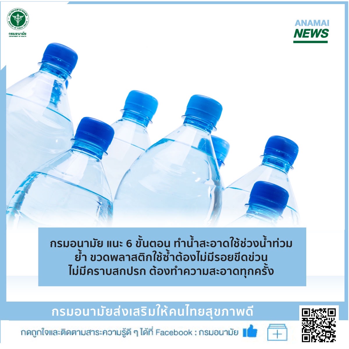 กรมอนามัย กระทรวงสาธารณสุข แนะนำ 6 ขั้นตอนทำความสะอาดน้ำใช้ ไว้ใช้ในบ้านช่วงน้ำท่วมพร้อมเตือนนำขวดพลาสติกมาใช้ซ้ำ ควรเลือกที่ไม่มีรอยขีดข่วน ไม่มีคราบสกปรก และทำความสะอาดอย่างถูกวิธี