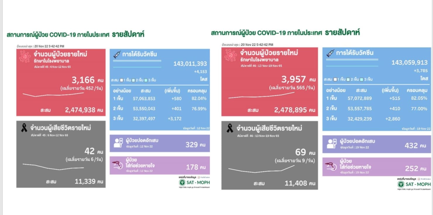 ต้อนรับเสร็จสิ้นการประชุมเอเปคและเริ่มต้นเทศกาลบอลโลก สถิติโควิดสัปดาห์ที่ 46 พรุ่งพรวดจากสัปดาห์ที่ 45 อย่างเห็นได้ชัดเจน โดยเฉพาะจำนวนผู้ป่วยอาการรุนแรงที่เพิ่มจาก 329 คน เป็น 432 คน หรือเพิ่มขึ้น 31.3% ส่วนผู้ป่วยใช้เครื่องช่วยหายใจเพิ่มจาก 178 คน เป็น 252 คน หรือเพิ่มขึ้น 41.6% ในขณะที่ตัวเลขการฉีดวัคซีนเข็มที่สามเพิ่มขึ้นแค่สัปดาห์ละราว 3,000 เข็ม นั่นหมายถึงว่าในอีกสองถึงสามสัปดาห์ถัดไป ตัวเลขผู้เสียชีวิตน่าจะพุ่งขึ้นไปถึงวันละ 15 คนได้อีกครั้ง
