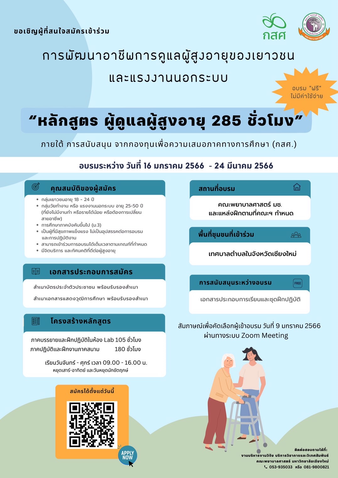 คณะพยาบาลศาสตร์ มช. ขอเชิญร่วมการอบรมหลักสูตร ผู้ดูแลผู้สูงอายุ 285 ชั่วโมง (เรียนฟรี)