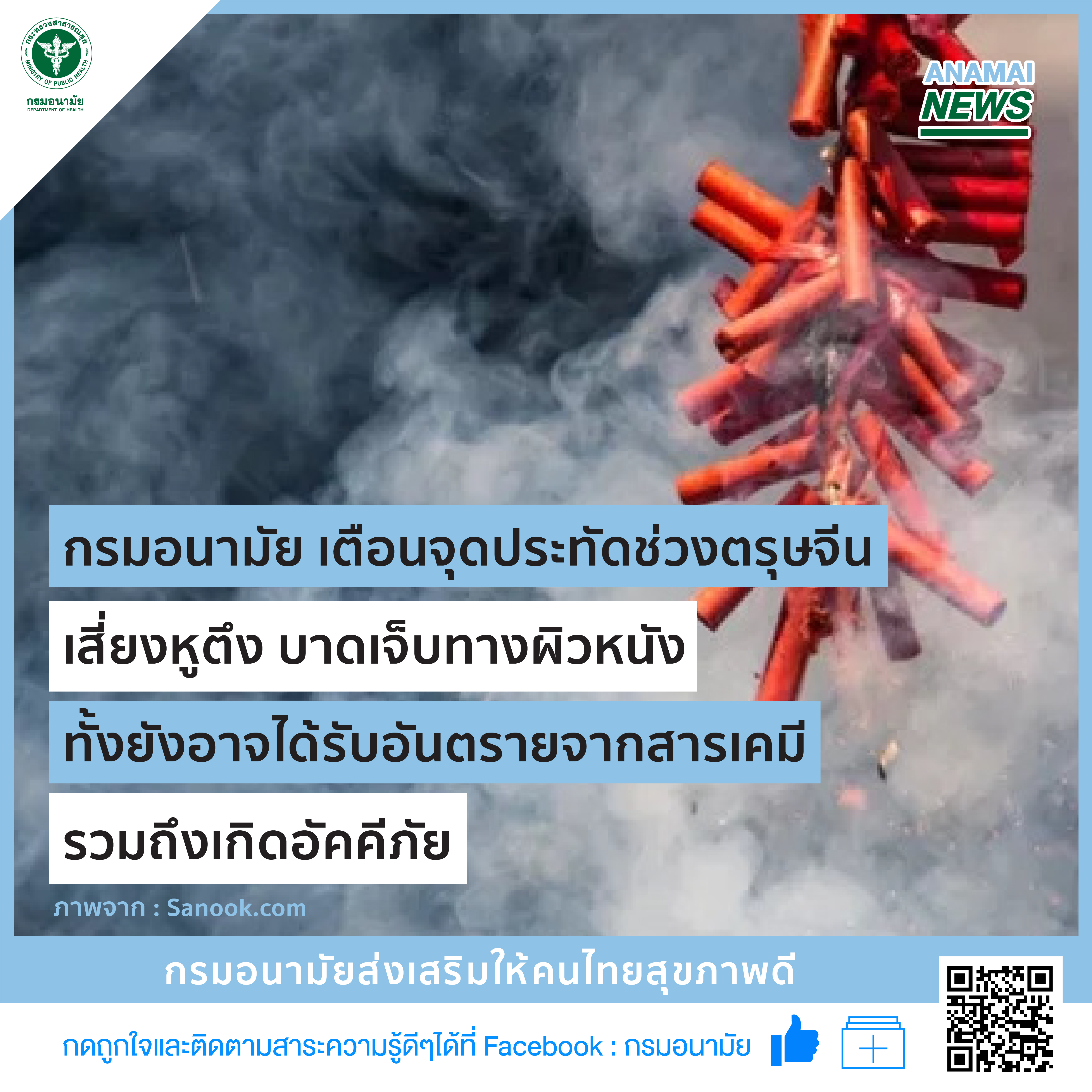 นายแพทย์สุวรรณชัย วัฒนายิ่งเจริญชัย อธิบดีกรมอนามัย กล่าวว่า ในช่วงเทศกาลตรุษจีนขอให้ประชาชนระมัดระวังอันตรายที่อาจจะเกิดขึ้นจากการจุดประทัด โดยเฉพาะในกลุ่มเด็กและวัยรุ่น ซึ่งผู้ปกครองต้องดูแลอย่างใกล้ชิด เนื่องจากอาจได้รับอันตรายจากการโดนสะเก็ดประทัด ทำให้ผิวหนังไหม้ รวมถึงอาจได้รับบาดเจ็บจากประทัดระเบิดจนถึงขั้นสูญเสียอวัยวะ หรือหากสัมผัสหรือสูดดมเอาสารเคมีที่อยู่ในรูปของเหลว