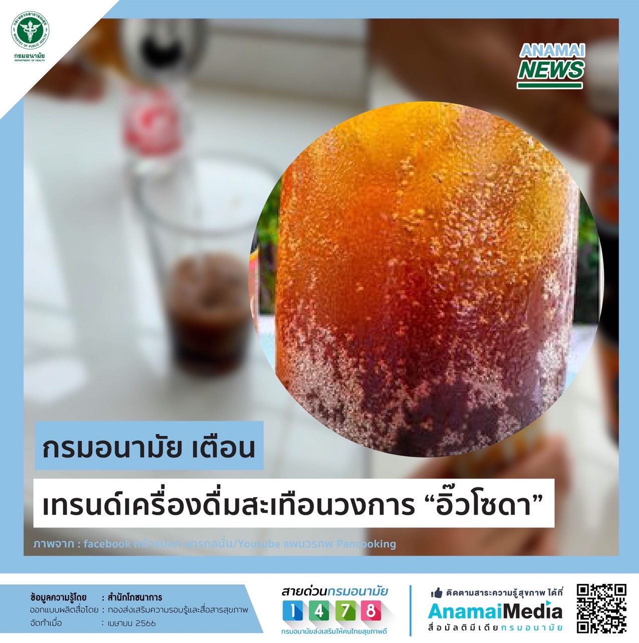 ดร.นายแพทย์สราวุฒิ บุญสุข รองอธิบดีกรมอนามัย กล่าวว่า จากกรณีมีการคิดสูตรเทรนด์เครื่องดื่มใหม่ “อิ๊วโซดา” ที่กำลังเป็นกระแสในโลกโซเชียล โดยการนำซีอิ๊วดำสูตรเฉพาะ (สูตรราดบนไอศกรีม) 3 ช้อนโต๊ะผสมกับเครื่องดื่มโซดา 1 กระป๋อง เพื่อดื่มคลายร้อน ซึ่งซีอิ๊วนี้มีส่วนประกอบหลัก คือ น้ำตาลทรายร้อยละ 56 กลูโคสไซรัป ร้อยละ 13.4 และซีอิ๊ว (soy sauce ) ร้อยละ 13.6 จากส่วนผสมดังกล่าว หากผสมซีอิ๊ว 3 ช้อนโต๊ะ เครื่องดื่มแก้วนั้น จะมีปริมาณน้ำตาลสูง ซึ่งข้อมูลจาก สำนักงานคณะกรรมการอ้อยและน้ำตาลทราย สำรวจพบคนไทยกินน้ำตาลมากถึง 25 ช้อนชาต่อวัน ซึ่งเกินกว่าที่องค์การอนามัยโลก (WHO) กำหนด คือ ไม่ควรกินน้ำตาลเกิน 6 ช้อนชาต่อวัน ซึ่งหากประชาชนนำซีอิ๊วดำที่ผลิตสำหรับใช้เป็นเครื่องปรุงรสมาทำตามอัตราส่วนดังกล่าว เครื่องดื่มแก้วนั้นจะมีโซเดียมสูงถึง 3,600 มิลลิกรัม (ซีอิ้วดำ 1 ช้อนโต๊ะ มีโซเดียมประมาณ 1,200 มิลลิกรัม) ซึ่งเกินกว่าปริมาณที่เหมาะสมต่อร่างกาย ตามคำแนะนำขององค์การอนามัยโลก เพื่อการมีสุขภาพที่ดี กำหนดให้บริโภคโซเดียมไม่เกิน 2,000 มิลลิกรัมต่อวัน หรือเทียบเท่าเกลือ 1 ช้อนชา หรือ 5 กรัม หรือน้ำปลาไม่เกิน 4 ช้อนชา หรือคิดเป็นปริมาณซีอิ๊วดำไม่เกิน 6 ช้อนชาต่อวัน