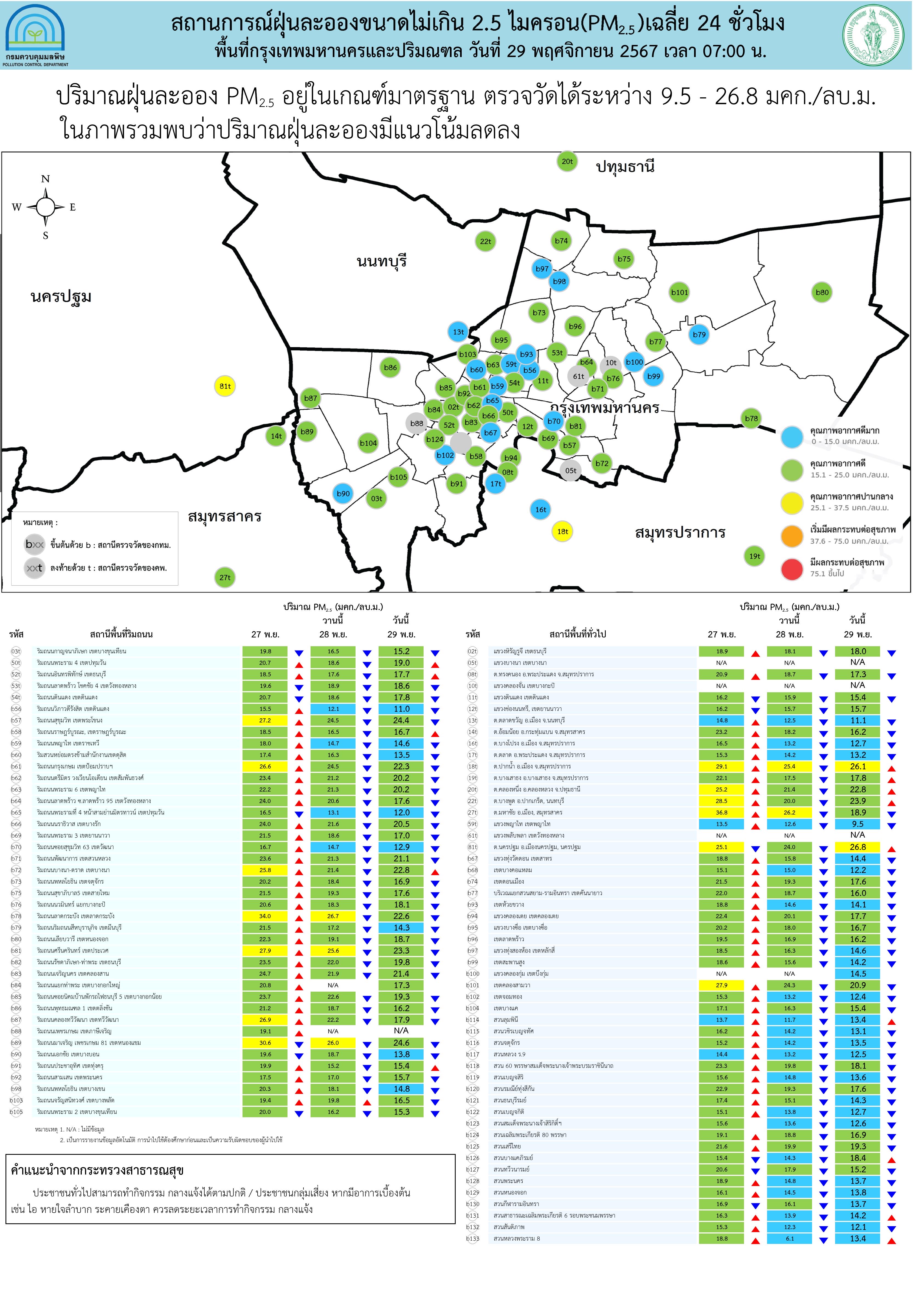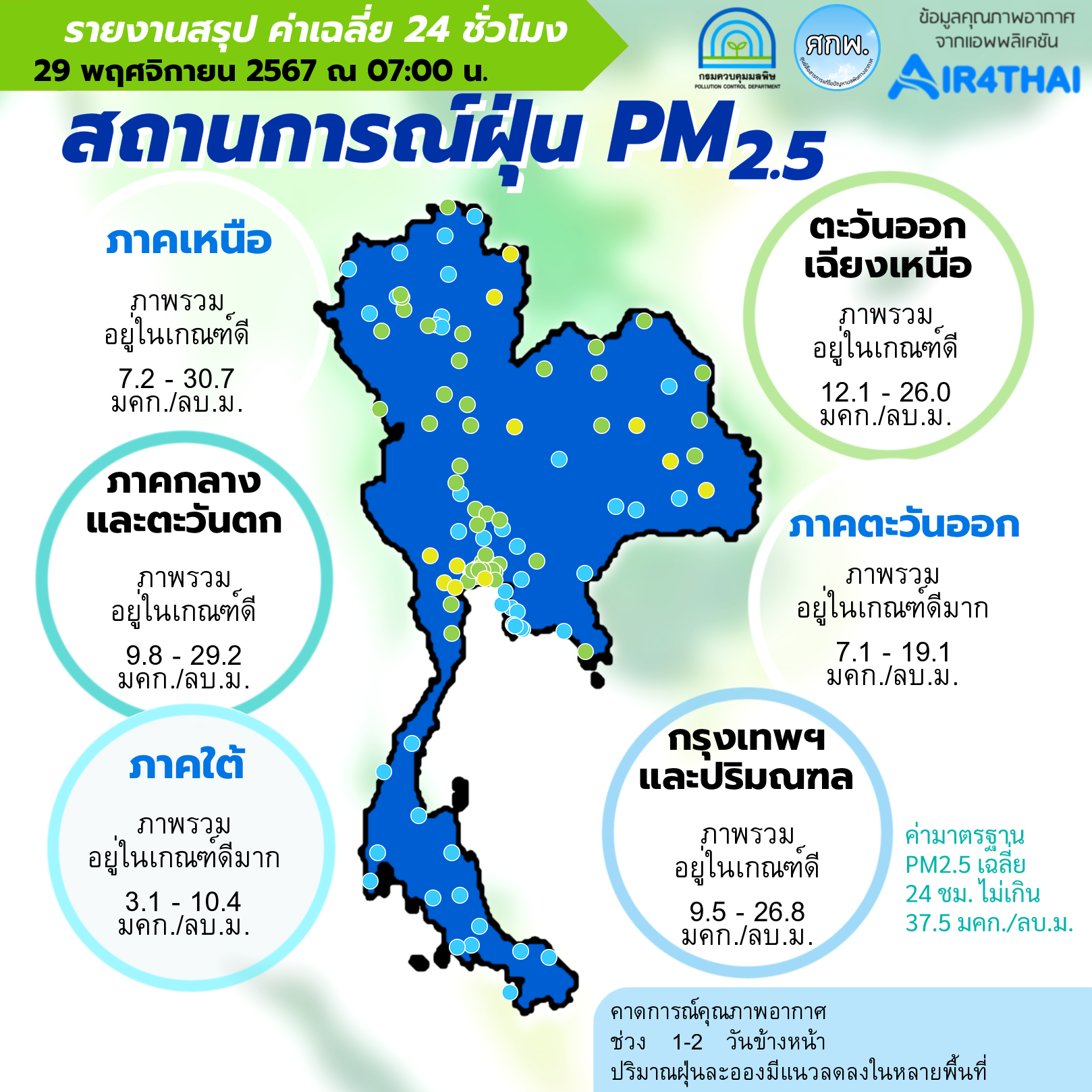 ศูนย์สื่อสารการแก้ไขปัญหามลพิษทางอากาศ รายงานการติดตามตรวจสอบคุณภาพอากาศ ประจำวันที่ 29 พฤศจิกายน 2567 ณ 07:00 น สรุปดังนี้ ภาพรวมปริมาณ PM2.5 ในประเทศอยู่ในเกณฑ์มาตรฐาน ส่วนใหญ่อยู่ในระดับดีมาก – ปานกลาง