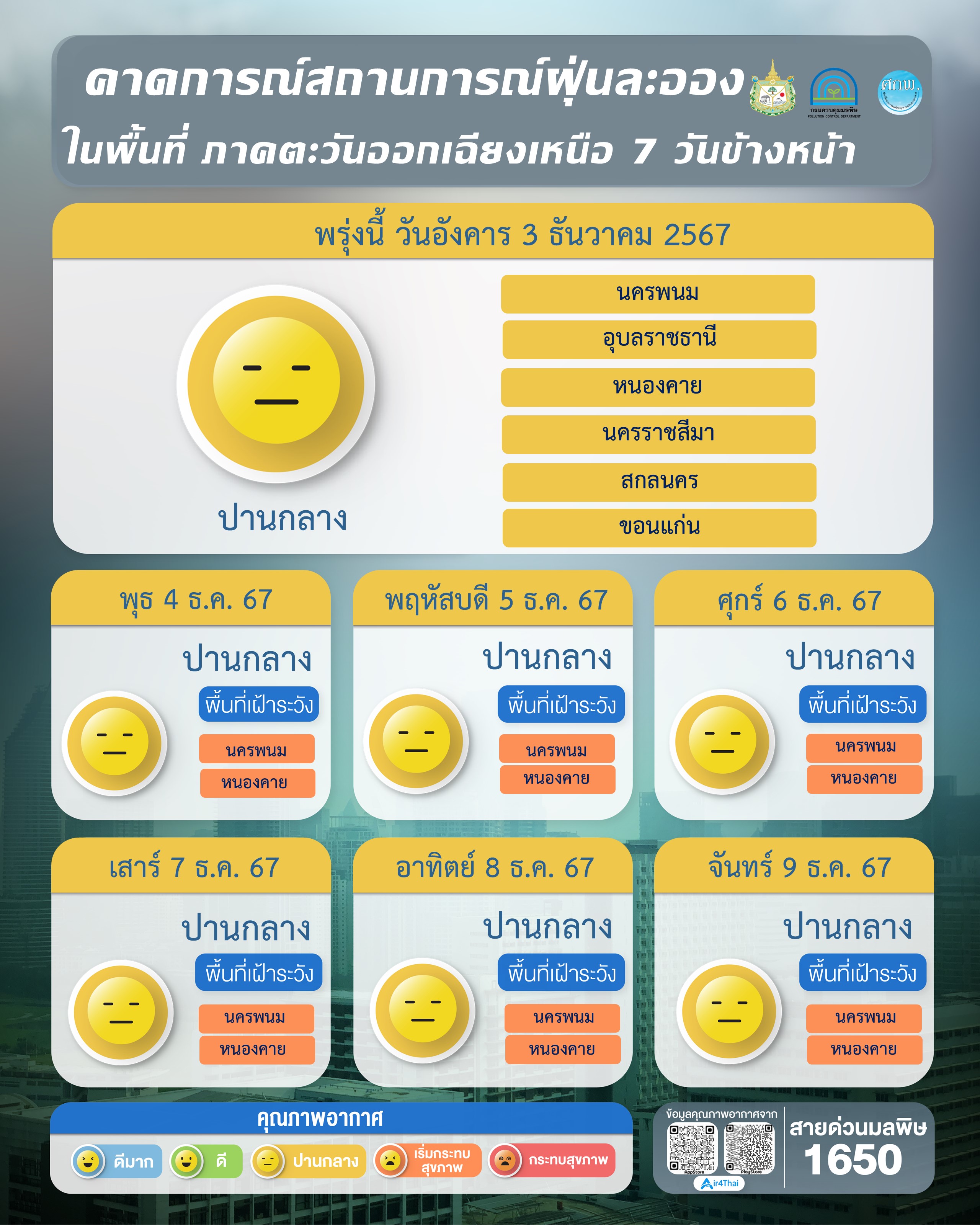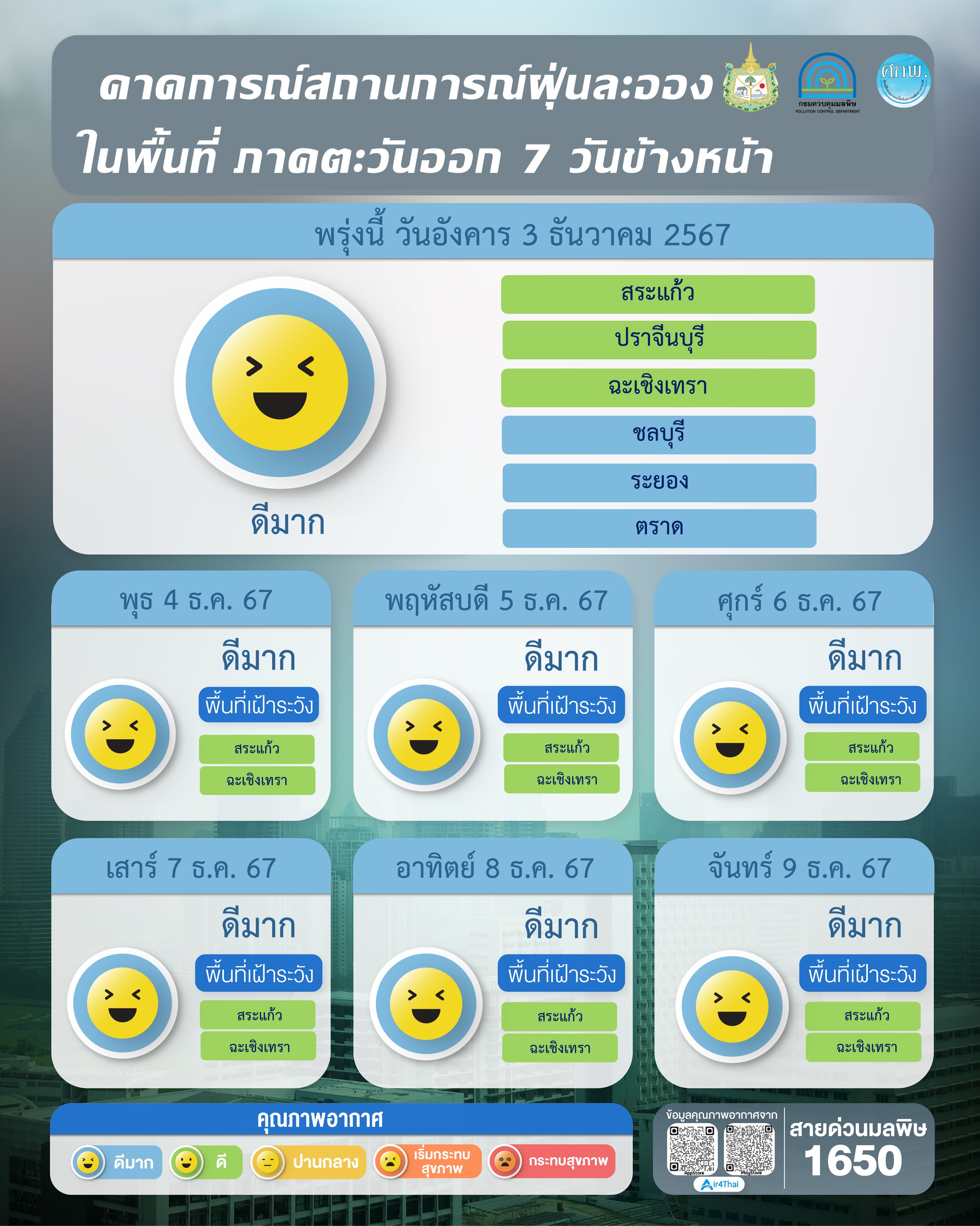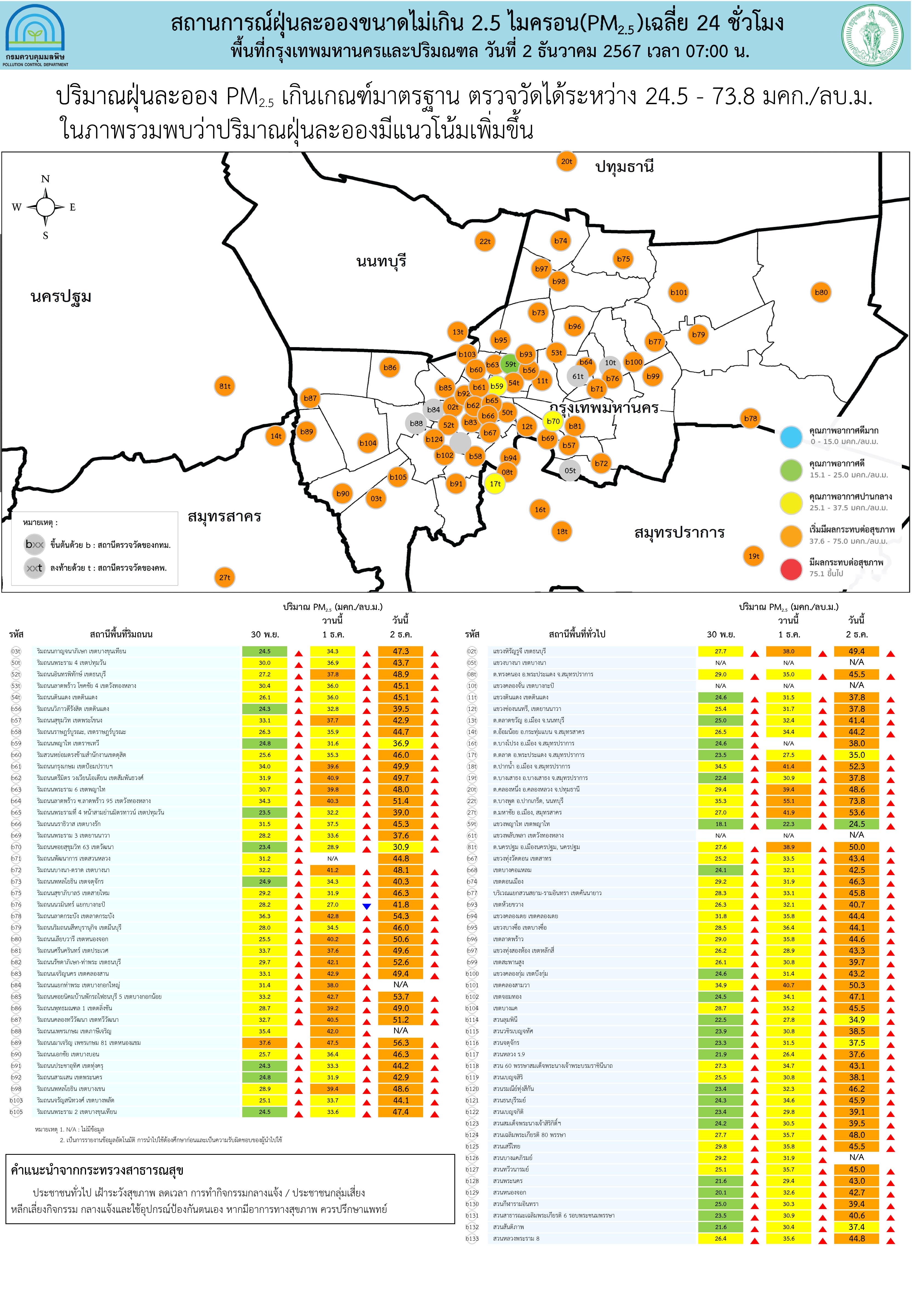 ศูนย์สื่อสารการแก้ไขปัญหามลพิษทางอากาศ รายงานการติดตามตรวจสอบคุณภาพอากาศ ประจำวันที่ 2 ธันวาคม 2567 ณ 07:00 น สรุปดังนี้